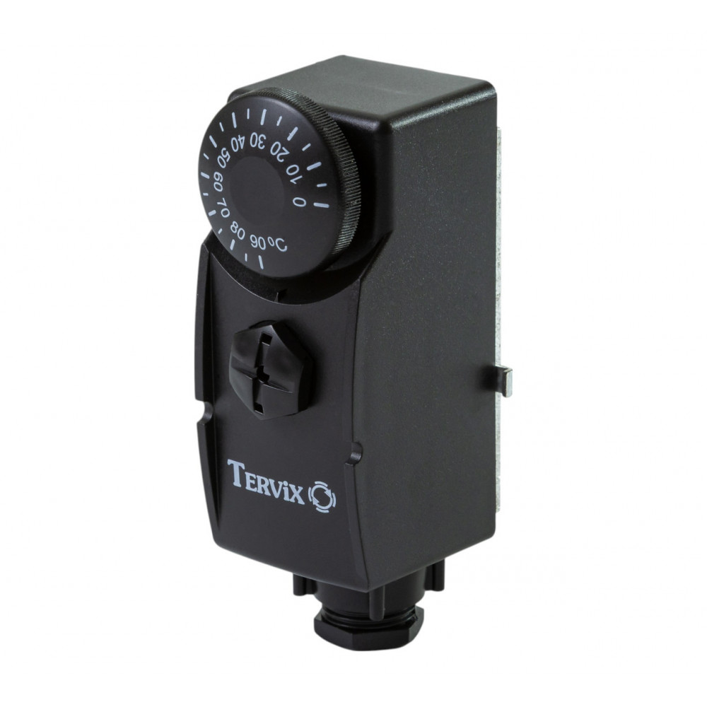 Термостат накладний Tervix Pro Line 101010 — призначений для автоматичного регулювання котлів, теплових насосів та іншого обладнання (циркуляційний насос, сервопривід, вентилятор і т.д.). Це контактний термостат з рідинним термоелементом, що перемикає або розмикає контакти. Укомплектований напрямним пристроєм для кабелю і особливо підходить для вимірювання і регулювання температури в трубах опалювальних установок. Принцип роботи При зміні температури теплоносія в трубі термостат замикає або розриває електричний ланцюг в залежності від величини виставленої температури. Фіксація термостата здійснюється за допомогою пружинного затиску, що забезпечує надійне з'єднання з трубою. Тепло передається термоелементу шляхом прямого контакту з трубою теплоносія. ]]>