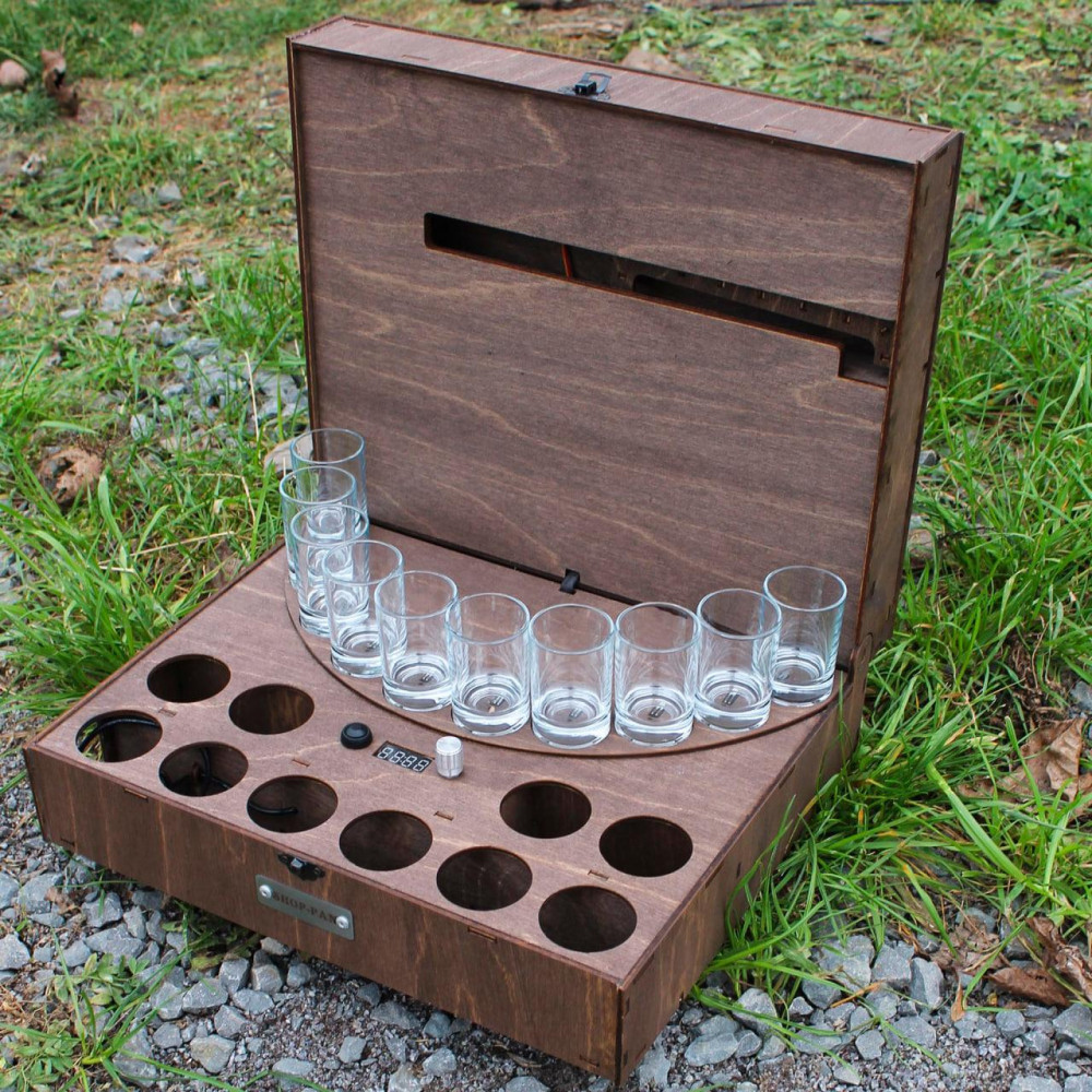 Функціональний механічний пристрій, призначений для дозування спиртного. Апарат здійснює розлив напою, кількість рідини, що наповнюватиме ємність, регулюється. Наливатор стане оригінальним подарунком для любителів ексклюзиву. Режими пристрою: атоматичний або ручний. Комплектація: наливатор шланга харчова USB-кабель 8 чарок гравірування на кришку наливатора Додатково можна придбати: гравірування на чарках - 50 грн / шт повербанк 5000 мА / 10000 мА