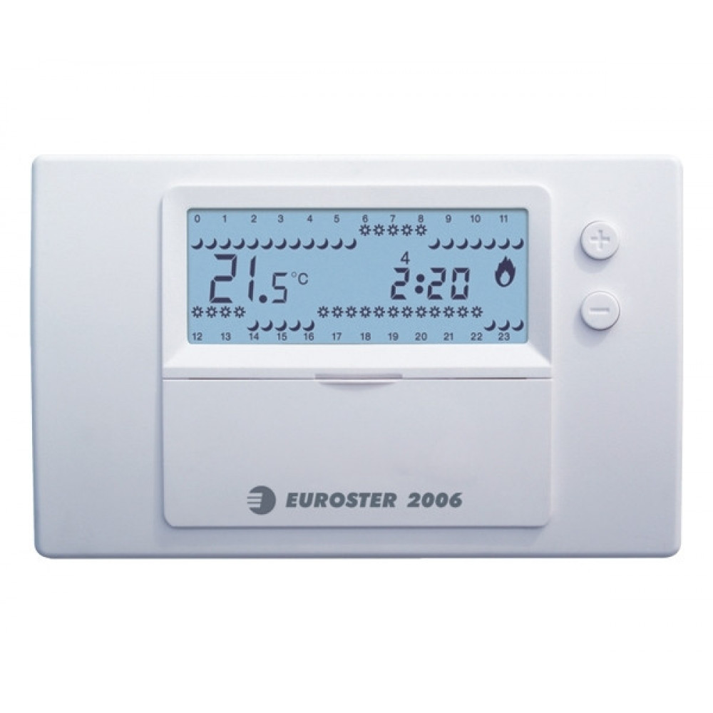 Управляє температурою в приміщеннях. Регулятор оснащений функцією спрощеного, інтуїтивного програмування, з можливістю зміни рівня температури без входу в програму. Використовуванний в регуляторі Euroster 2006 датчик дозволяє зчитувати температуру з точністю до 0,1ºC і програмувати температуру з точністю до 0,2ºC. Euroster 2006 працює в трьох режимах температури: денний, нічний і температура проти замерзання. Денну і нічну температуру можна модифікувати, а температура проти замерзання є постійною величиною. Контролер можна запрограмувати в семиденний цикл, з точністю до 0,5 години, що дає можливість зміни рівня температури 48 разів протягом доби. Регулятор дозволяє запрограмувати різні часові інтервали для кожного дня тижня. Після включення, регулятор працює згідно з такими заводськими налаштуваннями для певних часових інтервалів: комфортна температура (20,4ºC) пн - пт 6:00 - 22:00 год., Сб - нд: 7:00 - 22:30. Нічна температура (16,2ºC) пн - пт 22:00 - 6:00 ч., Сб - нд 22:30 - 7:00 ч. Всі настройки можна модифікувати на кожен день тижня, на свій розсуд. Терморегулятор Euroster 2006 дає можливість роботи джерела тепла з постійним налаштуванням, тимчасовою зміною температури і налаштуванням захисту від замерзання 5ºC ]]>