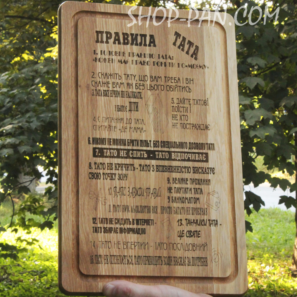 Кухонна дошка з гравіруванням правила татаКухонна дошка з вашим гравіюванням. що може бути незвичайніше? Друзі! Тепер у нас є і таке, ми не будемо переставати додавати в наш асортимент нові види продукції, адже ми вас любимо і цінуємо, тому хочемо робити для вас більше крутих пропозицій. На дошку можна нанести будь-який текст привітання або малюнок. І ваша дошка буде вже точно в єдиному екземплярі! З вас креатив (картинка, текст, логотип) що найкраще характеризує майбутнього власника. З нас - реалізація! Підійде для всіх! Навіть для тих, хто не вміє готувати, тому що з такою дощечкою гріх не навчитися :) ???? Shop-Pan – ваш прямий постачальник туристичного спорядження та ексклюзивних аксесуарів для дому та відпочинку Пропонуємо широкий асортимент товарів для туризму, кемпінгу, риболовлі та пікніків – якісні вироби, перевірені часом та зібрані з любов'ю до деталей. ???? Широкий асортимент продукції У нашому каталозі представлені: ✅ Туристичні сковороди, турбо-пічки, котли, коптильні, ножі, рибальські сумки, ліхтарі та багато іншого ✅ Надійні товари для активного відпочинку, будинки та кухні – все для зручності та натхнення. ✅ Рішення для будь-якого стилю життя - від походів до домашнього затишку ✅ Збалансований вибір: еко-продукція з дерева, кухонні гравівальні дошки, фартухи з вашим принтом, монастирі, мангали, шампури, годинники та постери ✅ Аксесуари з можливістю персоналізації – зробіть свій подарунок унікальним ✅ Якість, естетика та турбота в кожному виробі – без прихованих недоліків та компромісів ???? Професійні консультації Менеджери проконсультують щодо вибору товарів. Працюємо: Пн-Пт 10:00 – 18:00, Сб 11:00 – 16:00. Зв'язок: Viber, Telegram, WhatsApp. ???? Швидка доставка по Україні ???? Замовлення, оформлені до 16:00, надсилаються того ж дня. ???? Доставка найпопулярнішими службами України ???? Бонуси та знижки за відгуки! ???? ???? Оцініть якість товару та ГАРАНТОВАНО отримайте знижку або безкоштовну доставку на замовлення! ???? Нам особливо цінні фото- та відеовідгуки. ???? Повідомте про свій відгук менеджеру в Telegram, WhatsApp або Viber (на вибір) - і гарантовано отримайте приємний бонус! ???? Знайдіть нас у Google - "Shop-Pan" і ознайомтеся зі _______________________________ Чому обирають нас? ???? ✅ Якість, якій можна довіряти Практичні товари для дому, подорожей та активного відпочинку ✅ Зважений підхід, чесність та контроль якості на кожному етапі виготовлення ???? Від ексклюзивних сувенірів до туристичного спорядження – все для ваших цілей та подарунків ✅ Замовлення 24/7 - просто та швидко! ???? Наш сайт працює 24/7 ???? Менеджер відповість у месенджерах у зручний для вас час. ✅ Швидка доставка по Україні ???? Працюємо по всій Україні! ???? Розрахуємо вартість та підберемо зручний спосіб оплати. Отримайте посилку швидко та без клопоту. _______________________________ Як замовити? Простий алгоритм покупки: ✔ Оформіть замовлення через кошик або у месенджерах ✔ Ми зв'яжемося з вами для уточнення деталей ✔ Відправимо після оплати або післяплатою ✔ Отримайте замовлення у найближчому відділенні ???? "Shop-Pan" - Магазин, якому довіряють тисячі клієнтів, які цінують якість та оригінальність! ????Ми цінуємо кожного клієнта та гарантуємо відмінний сервіс та продукцію. ???? Зробіть замовлення зараз!