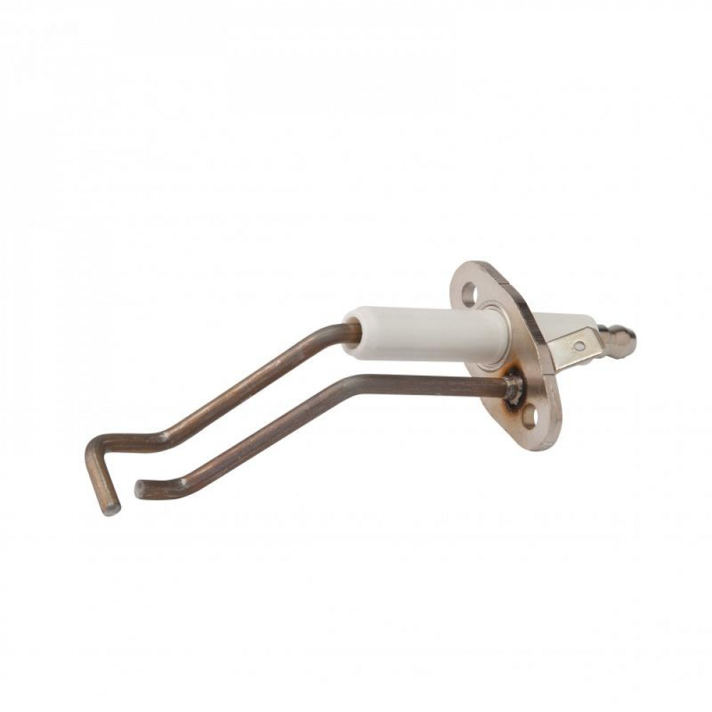 Електрод 3000001185 іонізації та розпалювання забезпечує займання газоповітряної суміші та контроль наявності полум'я. Встановлюється у безпосередній близькості до пальника та створює іскру, пропускаючи електричний розряд. Наявність полум'я контролюється електродом іонізації. Якщо пальник раптово згасне через різкий порив вітру або з будь-якої іншої причини, надходить відповідний сигнал платі управління, і подача газу припиниться.