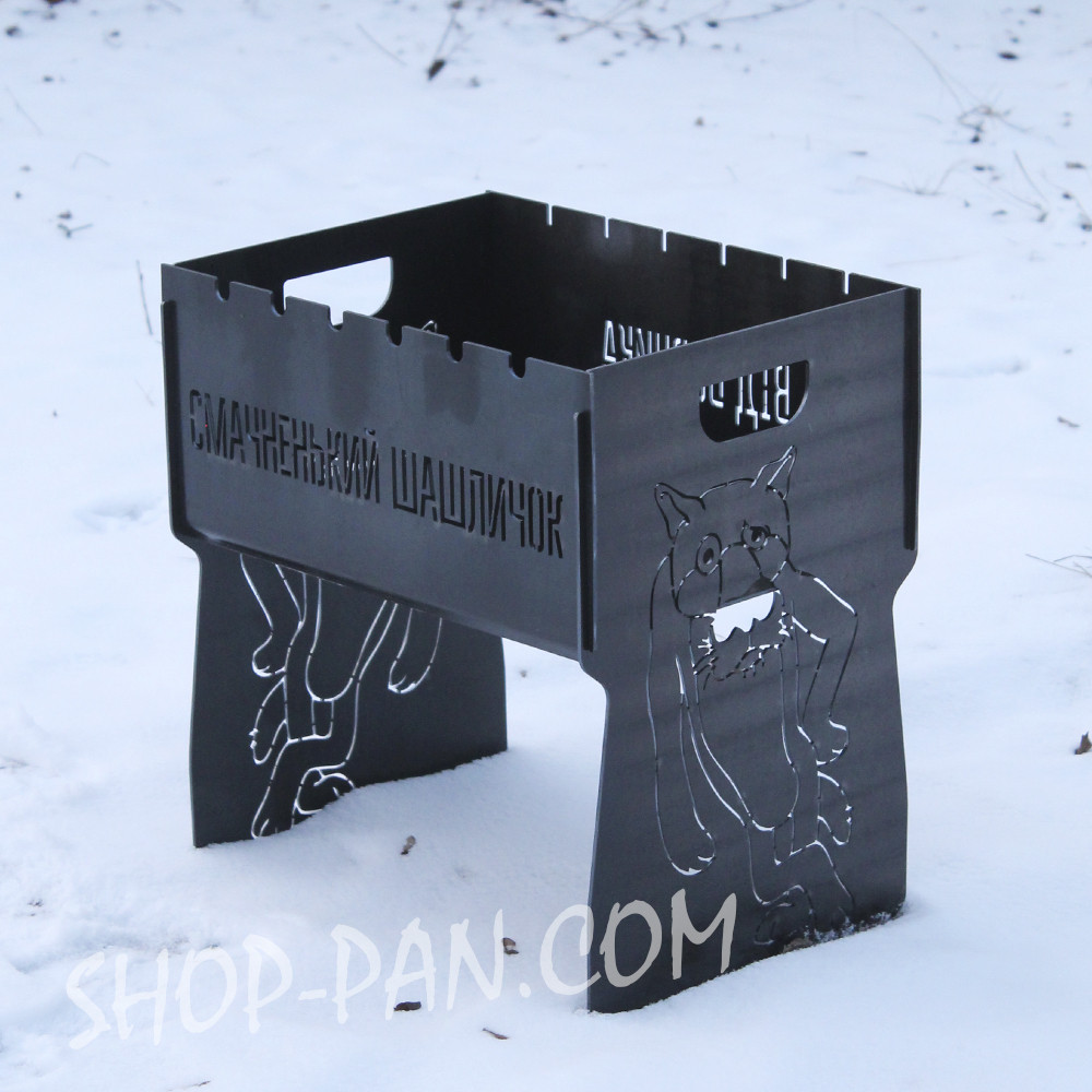 Мангал розбірний смачненький шашличок з індивідуальним гравіюванням - на подарунокМангал – чудовий подарунок прихильникам відпочинку на свіжому повітрі. А оригінальний іменний мангал, виготовлений за індивідуальним замовленням – це кращий спосіб вразити одного турботою та неординарним підходом до пошуку подарунків. Компактний мангал виготовлений з якісного металу, прослужити не одне десятиліття. Вигравіювати на ньому можна все що завгодно: ініціали власника, побажання, мотивуючі фрази або жартівливий підпис, якій оцінить ваш близький друг. Замовляйте іменний мангал у коробці з гравіюванням! Вартість створення складних зображень розраховується індивідуально. Великою зручністю є те, що в розібраному вигляді мангал можна переносити у чохлі як валізку. Купуючи подібний виріб наш клієнт отримує: · Високоякісний товар з нескінченним терміном використання. · Уважний підхід до створення шкірного виробу. · Розробка індивідуального дизайну мангалу. · Відображення на стінках будь-яких написів, символів. · Конструкція вирізається з міцного товстостінного металу. · Зберігає зовнішній вигляд і не деформується. · Повністю розбірний, займає мінімум місця.