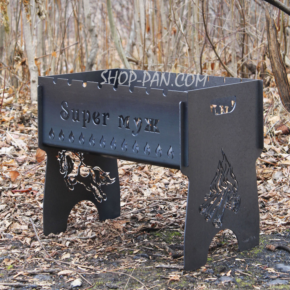 Мангал розбірний з індивідуальним гравіюванням - Super чоловікМангал – чудовий подарунок прихильникам відпочинку на свіжому повітрі. А оригінальний іменний мангал, виготовлений за індивідуальним замовленням – це кращий спосіб вразити одного турботою та неординарним підходом до пошуку подарунків. Компактний мангал виготовлений з якісного металу, прослужити не одне десятиліття. Вигравіювати на ньому можна все що завгодно: ініціали власника, побажання, мотивуючі фрази або жартівливий підпис, якій оцінить ваш близький друг. Замовляйте іменний мангал у коробці з гравіюванням! Вартість створення складних зображень розраховується індивідуально. Великою зручністю є те, що в розібраному вигляді мангал можна переносити у чохлі як валізку. Купуючи подібний виріб наш клієнт отримує: Високоякісний товар з нескінченним терміном використання. Уважний підхід до створення шкірного виробу. Розробка індивідуального дизайну мангалу. Відображення на стінках будь-яких написів, символів. Конструкція вирізається з міцного товстостінного металу. Зберігає зовнішній вигляд і не деформується. Повністю розбірний, займає мінімум місця.