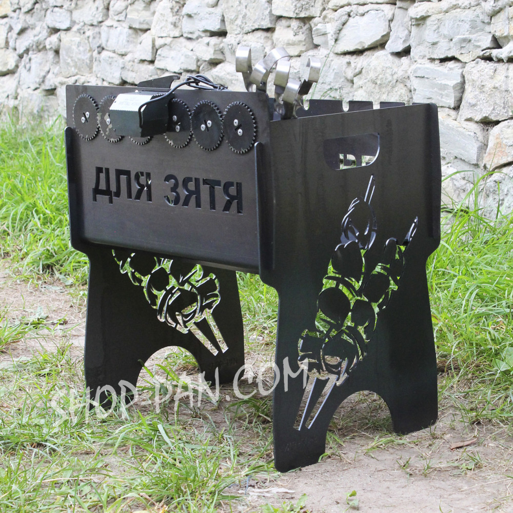 Мангал імний із вбудованою шашличницею та мотором на 6 шампурівІм'яний мангал із вбудованою шашличницею недорого Мангал із вбудованою шашличницею — знахідка для всіх, хто любить відпочивати на природі та готувати шашлик, але не бажає годинами стежити за процесом приготування. Шашличниця забезпечує рівномірне просмажування м'яса, не дає йому підгоріти. Наш мангал виготовлений із якісних матеріалів, які слугують довго, зберігають правильну форму та привабливий вигляд у процесі експлуатації. Пропонуємо іменні мангали на 6, 8, 10 і 12 шампурів. Незалежно від розміру, товар виробляється з безпечної та міцної сталі, що витримує високі навантаження, не виділяє шкідливих речовин під час нагрівання. Матеріал проходить ретельне оброблення. Вбудована шашличниця з мотором працює від портативного зарядного пристрою. Вона повільно прокручує шампури, завдяки чому м'ясо рівномірно просмажується з усіх боків, має апетитну скоринку, але не підгоряє, залишається соковитим. Цей пристрій дає змогу відвертати увагу від процесу приготування. Ви можете спілкуватися з друзями та насолоджуватися відпочинком на природі, поки м'ясо готується. Компактність і мобільність. Мангал не займає багато місця, його зручно возити із собою на природу. Якісні, міцні, довговічні матеріали. Сталь витримує високі навантаження, слугує багато років. Лаконічний дизайн та індивідуальність. Зробити мангал унікальним можна за допомогою іменного гравіювання. Шашличниця з мотором. Готувати м'ясо на шишличці, яка автоматично повертає шампура, дуже просто та зручно.
