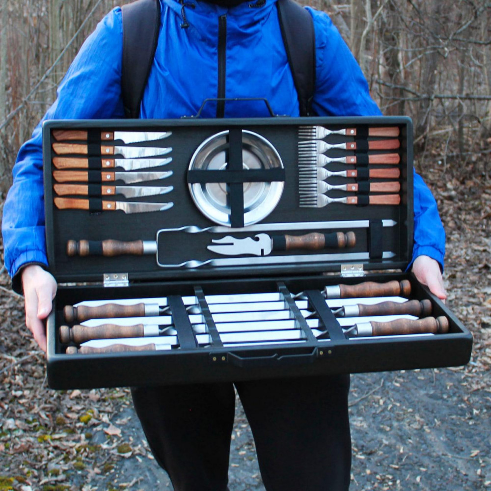 Набір для гриля та барбекю "Базовий" у дерев'яному кейсіПодарунковий набір для гриля – це комплект для пікніка та відпочинку на природі. Прибори та шампури продаються в естетичному дерев'яному кейсі, в ньому зручно зберігати та транспортувати набір. У набір входять: Виделка з дерев'яною ручкою 6 шт; Ніж столовий з дерев'яною ручкою 6 шт; Тарілка 6 шт; Шампур з дерев'яною ручкою 6 шт; Шампур подвійний; Вилка для зняття м'яса; Розмір дерев'яного кейсу: 69х29х11.5 см. Кейс із металевою ручкою. Розмір шампура: довжина – 63 см; завтовшки 3 мм. Шампури універсальні, підходять для приготування шашлику, а також морепродуктів та овочів на мангалі будь-якого типу. Відмінність відтінків кольорів фарб з різних партій може відрізнятися і містити неточності. Виробник залишає за собою право вносити зміни в технічні характеристики виробу.