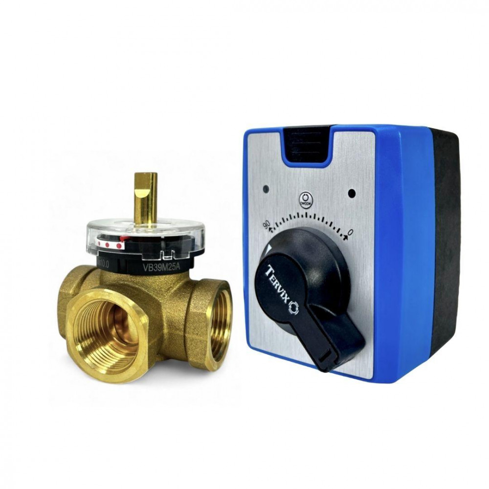 клапан RMV Tervix Pro Line () та привід AMV Tervix Pro Line (). Електричний привід AMV Tervix Pro Line призначений для роботи з 3-ходовими поворотно-змішувальними клапанами, такими як Tervix RMV. Керувати комплектом можна як автоматично за допомогою , , так і вручну за допомогою ручки, для цього потрібно натиснути і утримувати перемикач. Основна функція електропривода - змішування двох потоків через змішувальний клапан для отримання заданої температури на виході. В режимі змішування - при повороті заслінки в одну сторону буде поступово відкриватися прохід для гарячого теплоносія і в рівній мірі закриватися прохід для холодого.Це підвищує температуру змішаного робочого теплоносія при майже постійній швидкості потоку, відповідно при повороті заслінки в іншу сторону, прохід для гарячого теплоносія буде закриватися, а для холодого - відкриватися. Таким чином підтримується постійна задана температура теплоносія на виході з клапану. Використовується в системах для: - фанкойлів (кондиціонування); - опалення; - водопостачання; - та інших; ]]>