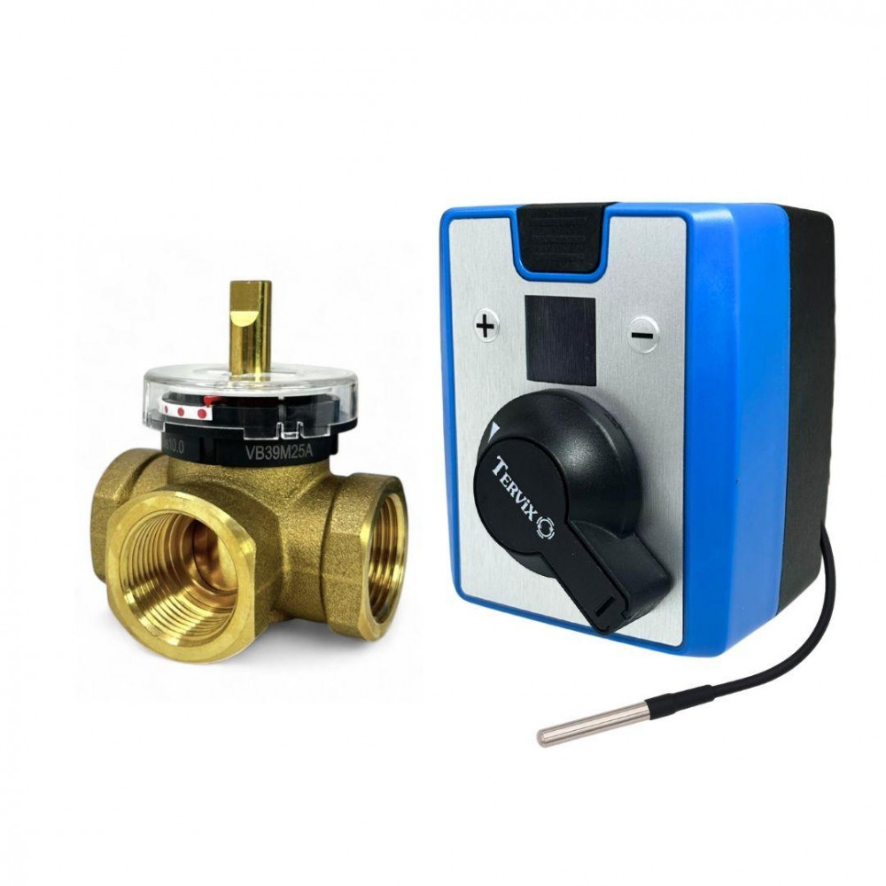 клапан RMV Tervix Pro Line () та привід CAMV Tervix Pro Line (). Привід-контролер СAMV Tervix Pro Line це незалежний прилад для підтримки постійної температри змішаного потоку теплоносія. Призначений для роботи з 3-х ходовими поворотно-змішувальними клапанами, такими як Tervix RMV. Керувати комплектом можна як автоматично, так і вручну за допомогою ручки, для цього потрібно натиснути і утримувати перемикач. Привід-контролер призначений для змішування двох потоків через змішувальний клапан для підтримання заданої температури на виході.В режимі змішування - при повороті заслінки в одну сторону буде поступово відкриватися прохід для гарячого теплоносія і в рівній мірі закриватися прохід для холодого.Це підвищує температуру змішаного робочого теплоносія при майже постійній швидкості потоку, відповідно при повороті заслінки в іншу сторону, прохід для гарячого теплоносія буде закриватися, а для холодого - відкриватися. Після підключення та налаштування привід-контролер буде працювати в автоматичному режимі та підтримувати задану температуру змішаного потоку шляхом підмішування холодного та гарячого потоків. Використовується в системах для: - фанкойлів (кондиціонування); - опалення; - водопостачання; - та інших; ]]>