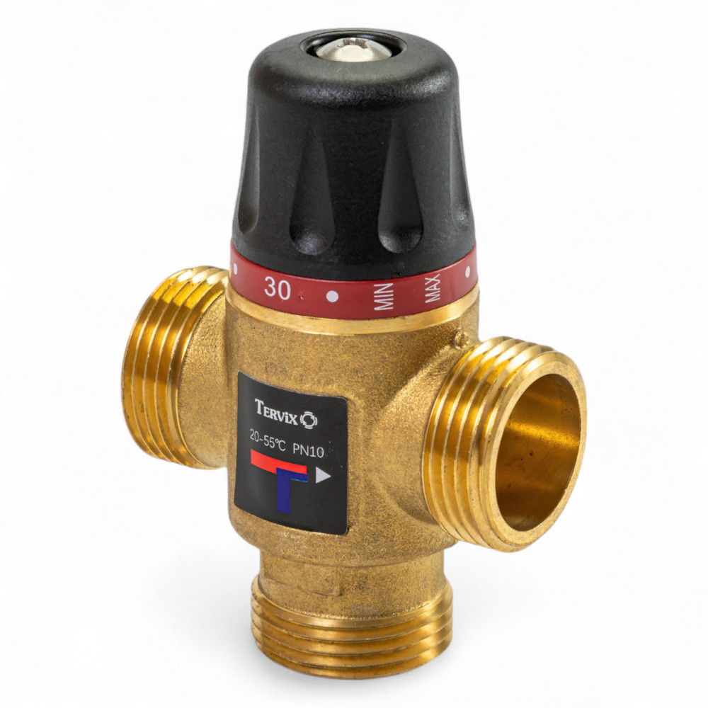 Термостатичний змішувальний клапан Tervix Pro Line TMV, G1" діапазон температури 20-55C, Kvs 2,5 арт. 312232 Увага! Вимоги для коректної роботи: середовище - тільки вода макс. темп. вхідної води +90°С витрата - не менше 6 л/хв не підходить для твердопаливних котлів для коректного налаштування потрібний зовнішній термометр Термостатичні змішувальні клапани Tervix Pro Line TMV призначені для регулювання температури шляхом змішування двох потоків води таким чином, що на виході вода має постійну задану температуру. Внутрішній термоелемент використовується для автоматичного регулювання співвідношення подачі гарячої та холодної води. Клапани широко використовуються в побутових системах гарячого водопостачання та системах теплої підлоги і опалення. Завдяки контролю температури в режимі реального часу, клапани забезпечують комфорт і безпеку та запобігають ошпарюванню користувачів або пошкодженню труб теплої підлоги та покриття підлоги через високі температури води. ]]>