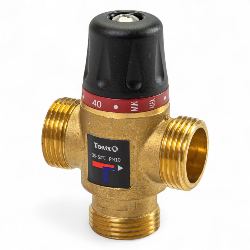 Термостатичний змішувальний клапан Tervix Pro Line TMV, G1" діапазон температури 35-60C, Kvs 2,5 арт. 312233 Увага! Вимоги для коректної роботи: середовище - тільки вода макс. темп. вхідної води +90°С витрата - не менше 6 л/хв не підходить для твердопаливних котлів для коректного налаштування потрібний зовнішній термометр Термостатичні змішувальні клапани Tervix Pro Line TMV призначені для регулювання температури шляхом змішування двох потоків води таким чином, що на виході вода має постійну задану температуру. Внутрішній термоелемент використовується для автоматичного регулювання співвідношення подачі гарячої та холодної води. Клапани широко використовуються в побутових системах гарячого водопостачання та системах теплої підлоги і опалення. Завдяки контролю температури в режимі реального часу, клапани забезпечують комфорт і безпеку та запобігають ошпарюванню користувачів або пошкодженню труб теплої підлоги та покриття підлоги через високі температури води. ]]>