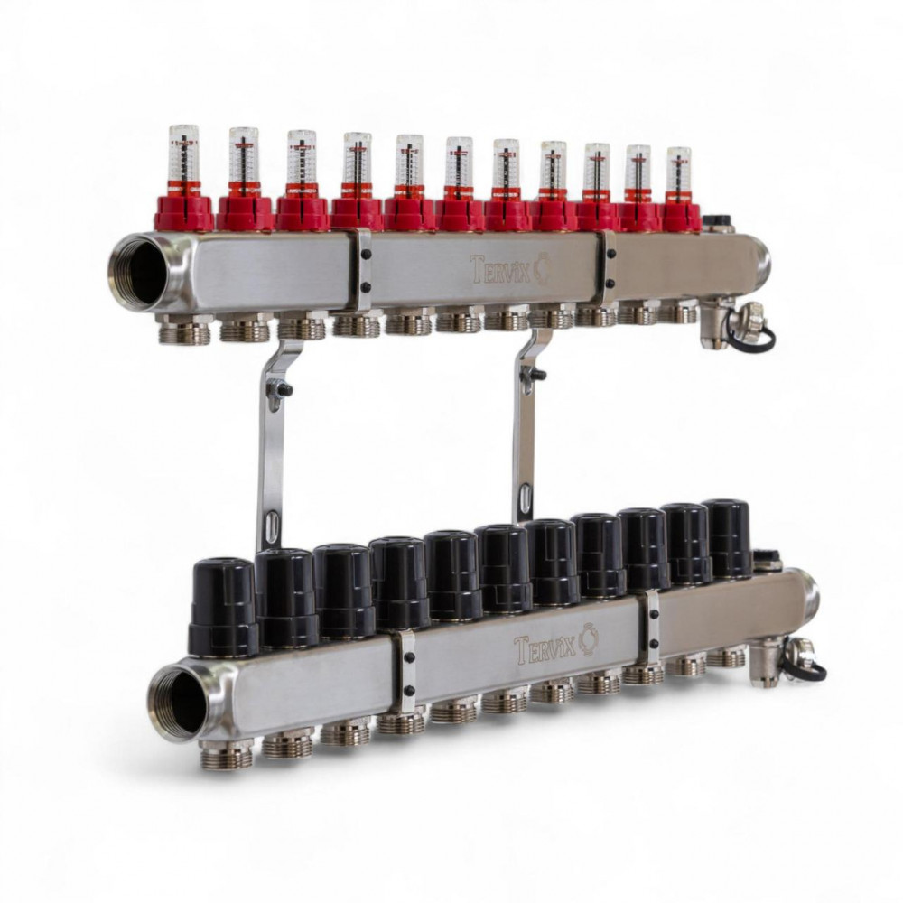 Розподільчі гребінки Tervix з нержавіючої сталі AISI 304 на 1’’ з витратомірами - регуляторами, ковпачками - регуляторами, краном Маєвського, зливним краном та виходами для контурів з кріпленнями 16*2 (євроконус) можуть бути від 2 до 12 контурів. Гребінки можуть використовуватися в трубопроводах систем питного і господарського холодного і гарячого водопостачання, опалення, стисненого повітря, а також на технологічних трубопроводах, що транспортують рідини, неагресивні до матеріалів гребінки. Гребінки призначені для розподілу потоку середовища окремим споживачам системи. Розподільчі гребінки Tervix призначені для використання в системах «Тепла підлога». За допомогою витратомірів легко встановити розрахункову витрату теплоносія через певний контур теплої підлоги. Переваги над аналогами: - від 2 до 12 контурів - полірована нержавійка 1,6 мм - ковпачки - регулятори - витратоміри - регулятори - вбудований кран «Маєвського» та зливний кран - гарантія 2 роки ]]>
