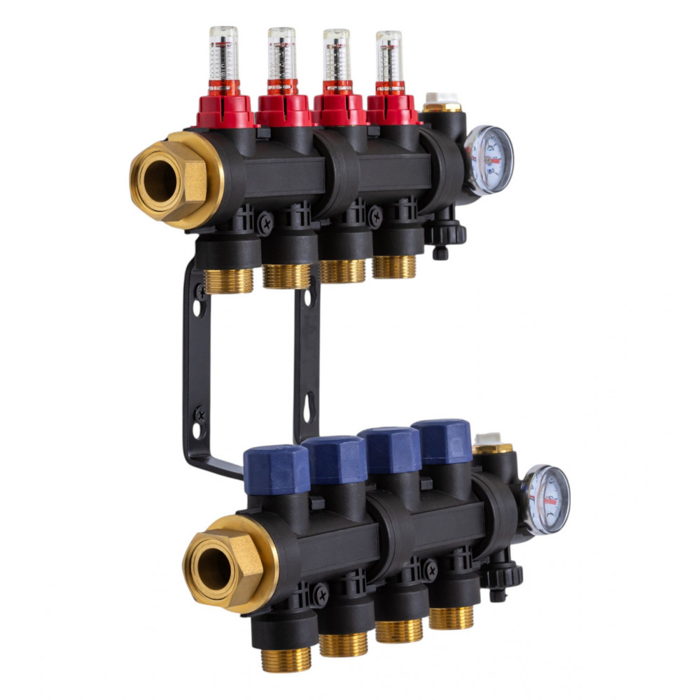До складу комплекту входять: Кріплення для колектора 2 колектора (подаючий і зворотний) Витратоміри: з регулюючими клапанами З’єднання під термопривід: М30 × 1,5 2 клапана наповнення/зливу 2 термометри ]]>
