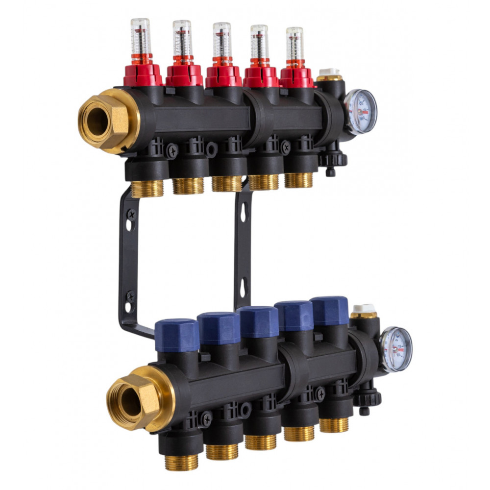 До складу комплекту входять: Кріплення для колектора 2 колектора (подаючий і зворотний) Витратоміри: з регулюючими клапанами З’єднання під термопривід: М30 × 1,5 2 клапана наповнення/зливу 2 термометри ]]>