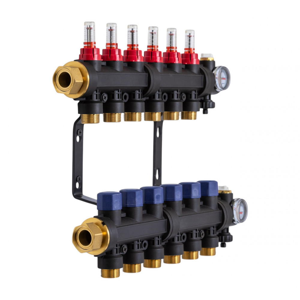 До складу комплекту входять: Кріплення для колектора 2 колектора (подаючий і зворотний) Витратоміри: з регулюючими клапанами З’єднання під термопривід: М30 × 1,5 2 клапана наповнення/зливу 2 термометри ]]>