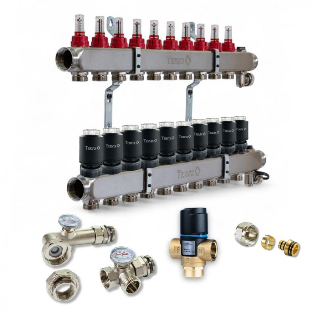 Опис: Готовий комплект обладнання для монтажу водяної теплої підлоги на 10 контурів. Ідеальне рішення для ефективного розподілу тепла в житлових чи комерційних приміщеннях. Усі елементи системи сумісні між собою та відповідають вимогам надійності, довговічності та енергоефективності. До складу комплекту входить: 1. 1 шт. 2. 20 шт. 3. 10 шт. 4. 1 шт. Переваги комплекту: Все необхідне в одному рішенні — не потрібно підбирати компоненти окремо. Висока якість компонентів Tervix. Оптимізований під системи водяної теплої підлоги. Вигідна ціна при купівлі комплекту Сфера застосування: Системи водяного підігріву підлоги в приватних будинках, квартирах, комерційних об’єктах.]]>
