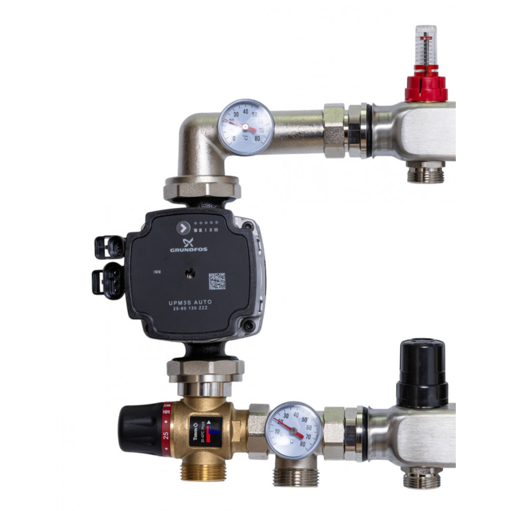 521451 Змішувальний вузол 1" для теплої підлоги Tervix Mixset з частотним насосом та клапаном TMV 1. Верхній з’єднувальний елемент з накидною гайкою для насосу та місцем під термометр 2. Накидна гайка для під’єднання насосу та термостатичного клапану 3. Нижній з’єднувальний елемент з накидною гайкою для підключення термостатичного клапану, підключення звороту та місцем під термометр 4. Термометр 5. Підключення звороту 1 ‘‘ 6. Підключення до гребінки 1 ‘‘ Змішувальний вузол повинен бути підключений до опалювальної системи з боку джерела тепла - зовнішня різьба 1’’. В комплект входить змішувальний клапан TMV (Tervix) (насос в комплект не входить). Рекомендується також використовувати кульові крани для підключення вузла до джерела тепла та до розподільчої гребінки. Змішувальний вузол з’єднується з розподільчою гребінкою зовнішньою різьбою 1’’. На змішувальний вузол можна встановити циркуляційний насос з базою 130 та 180 мм. Насос кріпиться двома накидними гайками.]]>