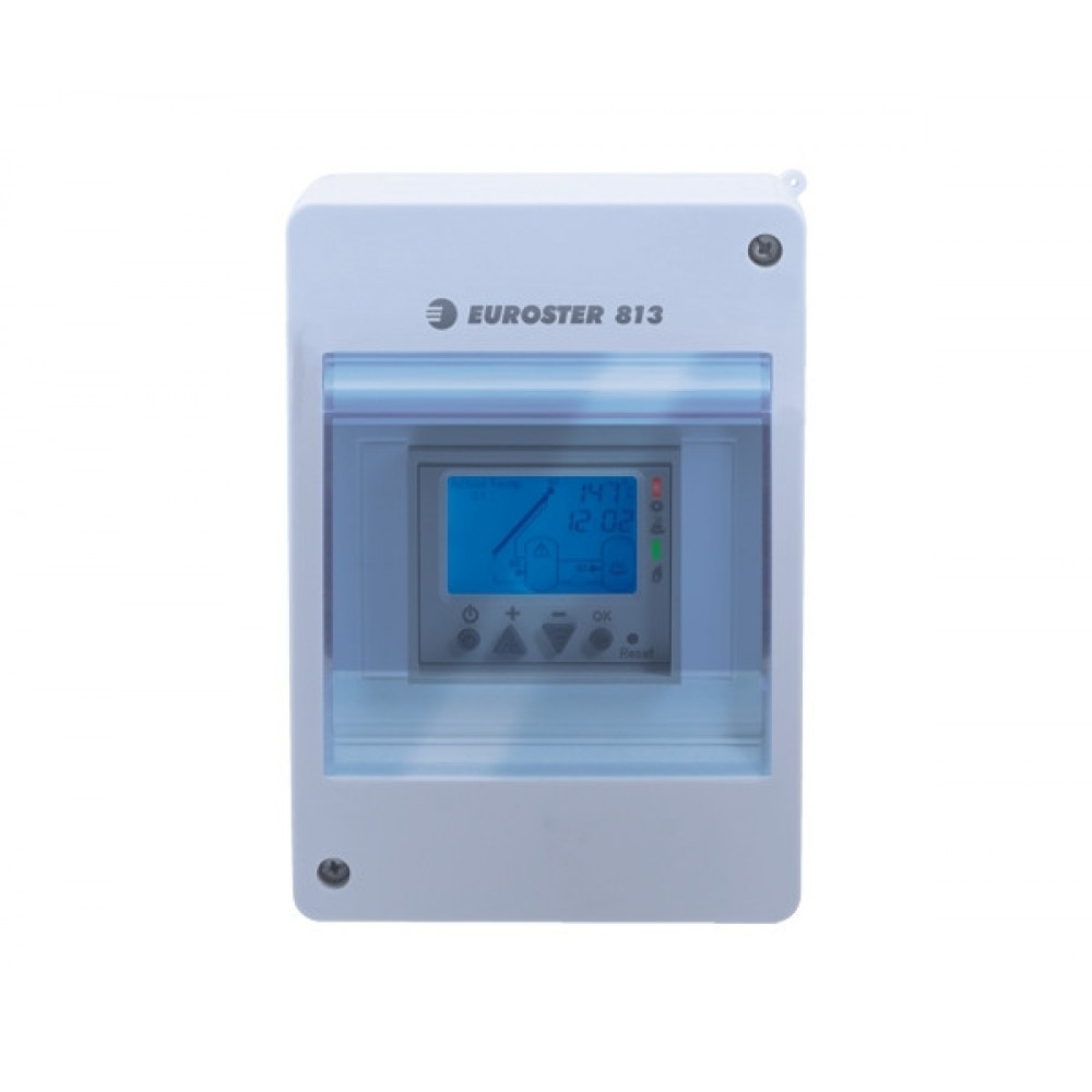 EUROSTER 813 є контролером соларної системи. Головним чином застосовується для підготовки гарячої води (ГВП) в домашньому господарстві. EUROSTER 813 стежить за температурою сонячного колектору і максимально двох баків-акумуляторів відповідно до обраного режиму роботи. Контролер 813 може також керувати додатковим джерелом тепла (котлом або електрообігрівачем), що забезпечує додаткове опалення, коли енергія, що отримується з сонячного колектору, є недостатньою. Користувач може запрограмувати інтервали часу, в які вмикається додаткове опалення. Контролер може працювати в одному з чотирьох режимів. Список доступних режимів залежить від підключення датчиків. Всі датчики автоматично визначаються контролером після включення живлення. Це запобігає помилковому встановленню режиму роботи. Схема установки для кожного режиму відображається на дисплеї. ]]>