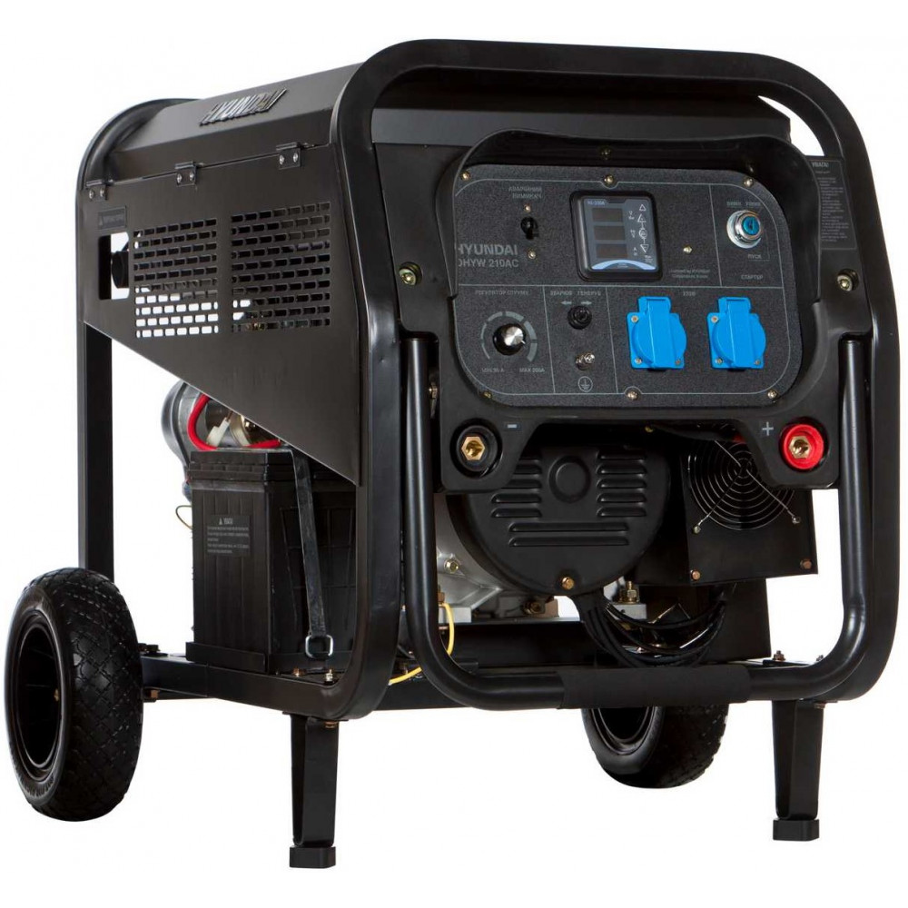 Призначення генератора Hyundai DHYW 210AC: Модель Hyundai DHYW 210AC генератора може використовуватися в якості резервного апарату, як для електродугового зварювання, так і джерела резервного електроживлення, для електроінструментів та електроприладів. Генератор може забезпечити електроживлення газового котла (0,5 кВт), холодильника (0,7 кВт), пральної машини (1 кВт) та ін. Особливості генератора Hyundai DHYW 210AC Двигун: чотиритактний. Ручний/електричний запуск. Оснащений датчиком контролю рівня мастила. Економічність: витрати палива становлять - 0,9 літрів на годину. Рама: В основі конструкції лежить трубчаста рама, яка забезпечує захист агрегату генератора, зручне перенесення і просту установку на будь-яку поверхню, в тому числі й нерівну. Дана модель оснащена колесами і ручками, що дозволяє легко переміщувати генератор по Вашій ділянці або об'єкті. Синхронний альтернатор: Для стабілізації вихідної напруги генератора Hyundai DHYW 210AC використовується синхронний альтернатор. Коливання вихідної напруги згладжуються в межах +-1%. Мідна обмотка генератора забезпечує: підвищений ресурс експлуатації; максимальну віддачу струму; відсутність надмірного нагрівання при роботі. Панель управління: інтуїтивно проста, доступна недосвідченому користувачеві. На ній виведені: кнопка запуску генератора, основні показники роботи (лічильник відпрацьованого часу (мотогодини)), розетки - 2 шт. по 16 ампер, клеми на 12В для зарядки акумуляторів, запобіжник на розетки, заземлення. Переваги моделі Hyundai DHYW 210AC Переваги моделі генератора Hyundai DHYW 210AC з дизельним двигуном: Експлуатація в будь-яку погоду: роботі генератора не заважають люті морози, висока температура повітря і вологість навколишнього середовища. Підвищений рівень безпеки: електричні проводи і кабелі надійно ізольовані. Заземлення корпусу апарату захищає від ураження електричним струмом. Система аварійного відключення убезпечить генератор від перегріву при роботі на максимальних навантаженнях. Простота експлуатації: модель генератора Hyundai DHYW 210AC призначена для професійного використання. З управлінням нею впорається навіть користувач без досвіду. Мобільність: відносно компактні розміри конструкції генератора та невелика вага дозволяють швидко і легко переміщувати по заміській ділянці або будівництві. Багатофункціональність: дана модель укомплектована зварювальним генератором, що дозволяє використовувати зварювання для Ваших потреб. Крім того, до даної моделі Ви можете підключити різні електроприлади та електроінструменти, і навіть підключити ваш будинок, об'єкт - все, що завгодно, в рамках потужності генератора. Довгий ресурс компонентів: генератор зібраний на спеціалізованому заводі з дотриманням світових стандартів якості. Рама має антикорозійне покриття. Довговічність силового агрегату забезпечує система повітряного охолодження. Комплектація моделі Hyundai DHYW 210AC: Генератор; Ключ запалювання; Акумулятор; Запобiжник; Керівництво по експлуатації. Трансортувальний комплект