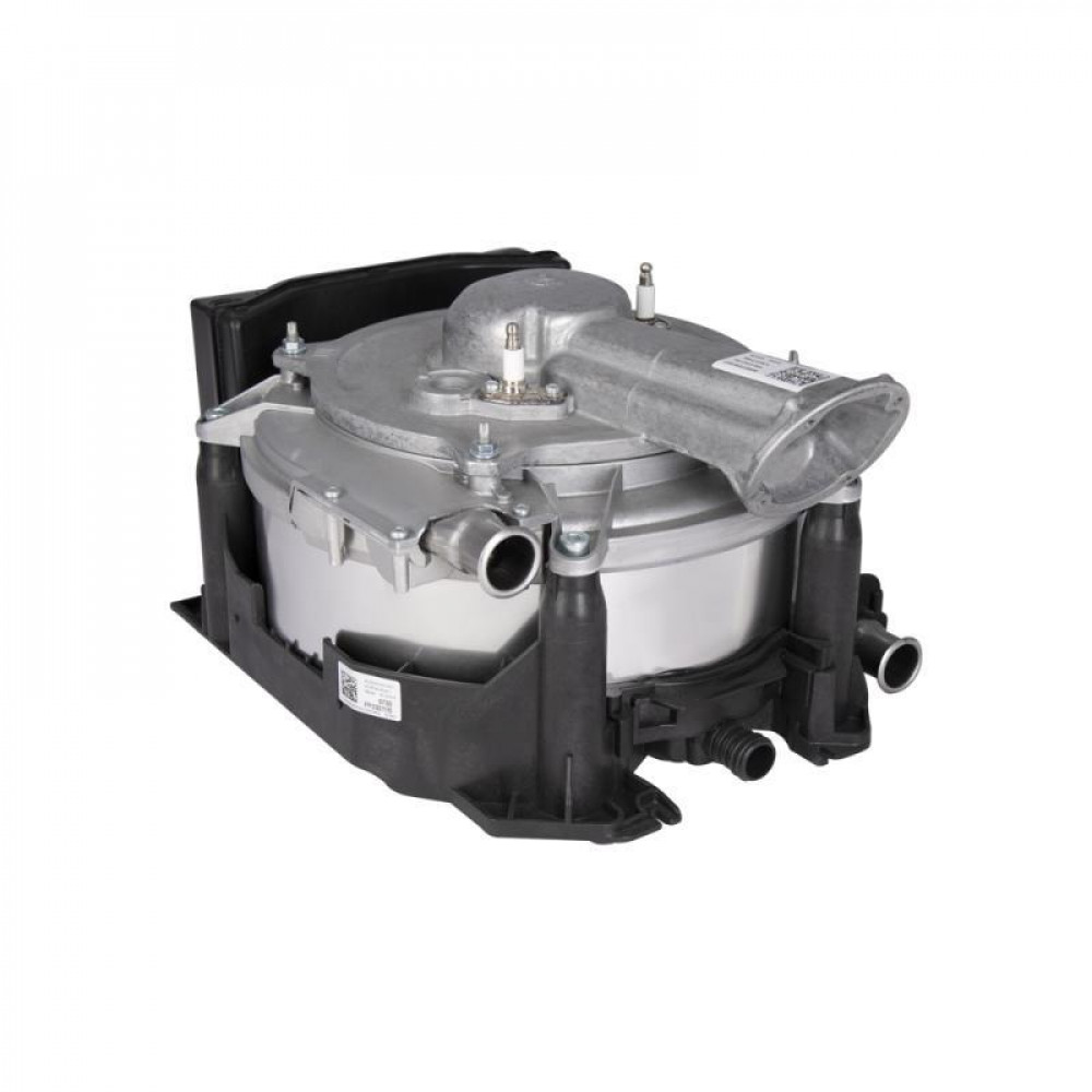 Теплообмінник служить передачі тепла, отриманого при згорянні палива, теплоносію системи опалення. Виготовлений із нержавіючої сталі, з корпусом із композитного матеріалу.