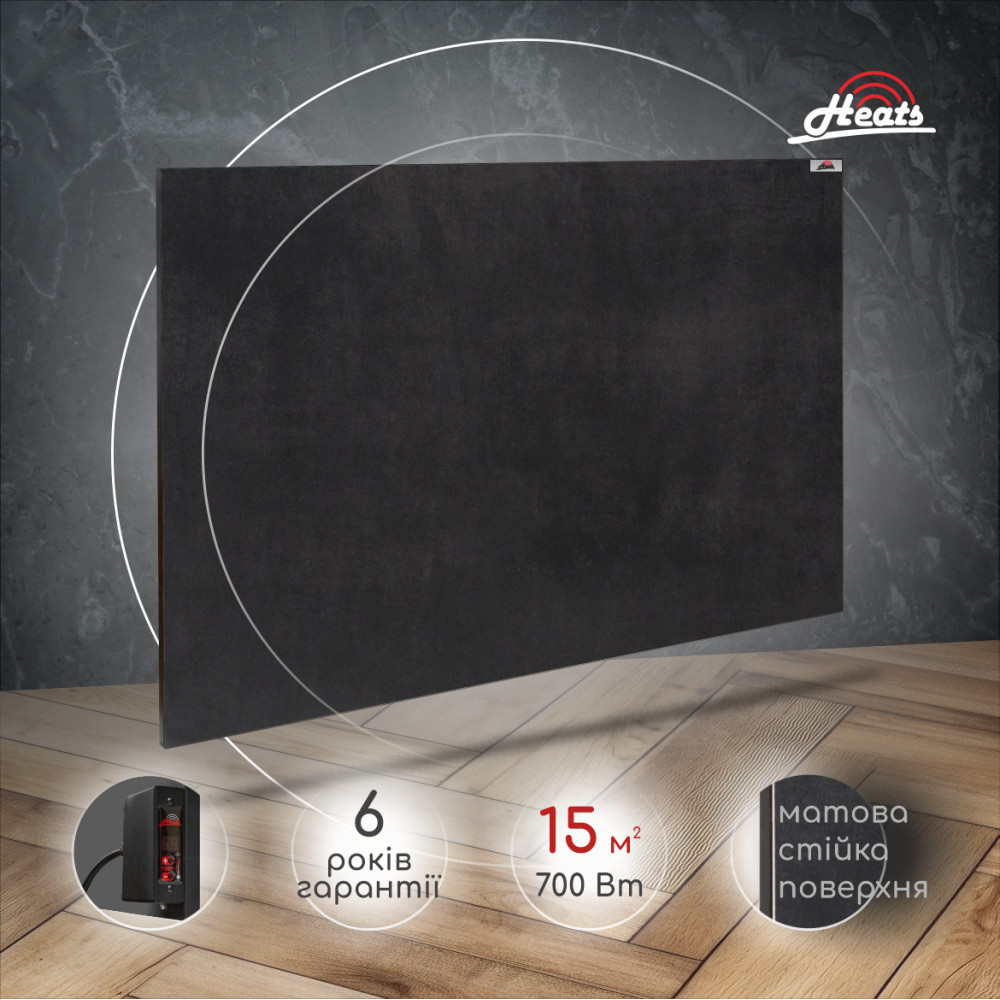 Heats 700AR – керамічний обігрівач з ідеальною матовою поверхнею майже вишуканого темного кольору Anthacite. Цей обігрівач закохає в себе з першого погляду. Стриманий та надійний охоронець вашого комфорту. Дана модель обігрівача має вбудований терморегулятор, що дає змогу налаштувати економний режим роботи обігрівача та самостійно встановити комфортну температуру в приміщенні. У вимкненому стані на табло регулятора завжди буде відображатись поточна температура в приміщенні. Існуючий режим «Таймер» дозволяє автоматично вимкнути обігрівач через заданий час. Обігрівач Heats – чудовий представник та незамінний елемент сучасних системи опалення, який розроблений для опалення приміщень будь-якого призначення. Весь модельний ряд даних обігрівачів представлений лінійкою від 200Вт до 1000Вт, створений в ексклюзивній кольоровій гамі найпопулярніших відтінків та має різні види комплектації. Головне завдання обігрівачів Heats – це створення тепла з мінімальними витратами електроенергії, однак не менш важливою місією ТМ «Heats» є зміна відношення споживачів до основних систем опалення. На своєму прикладі керамічні обігрівачі «Heats» показують чудовий приклад естетичного вирішення проблем з холодом, залишаючи далеко позаду конвекційні та водяні системи минулих поколінь