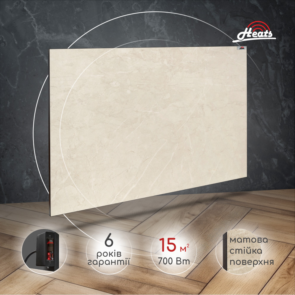 Heats 700SR – керамічний обігрівач з ідеальною матовою поверхнею теплого бежевого відтінку Stone. Цей обігрівач сподобається поціновувачам спокійних класичних інтер’єрів та з легкістю стане їх частиною. Дана модель обігрівача має вбудований терморегулятор, що дає змогу налаштувати економний режим роботи обігрівача та самостійно встановити комфортну температуру в приміщенні. У вимкненому стані на табло регулятора завжди буде відображатись поточна температура в приміщенні. Існуючий режим «Таймер» дозволяє автоматично вимкнути обігрівач через заданий час. Обігрівач Heats – чудовий представник та незамінний елемент сучасних системи опалення, який розроблений для опалення приміщень будь-якого призначення. Весь модельний ряд даних обігрівачів представлений лінійкою від 200Вт до 1000Вт, створений в ексклюзивній кольоровій гамі найпопулярніших відтінків та має різні види комплектації. Головне завдання обігрівачів Heats – це створення тепла з мінімальними витратами електроенергії, однак не менш важливою місією ТМ «Heats» є зміна відношення споживачів до основних систем опалення. На своєму прикладі керамічні обігрівачі «Heats» показують чудовий приклад естетичного вирішення проблем з холодом, залишаючи далеко позаду конвекційні та водяні системи минулих поколінь