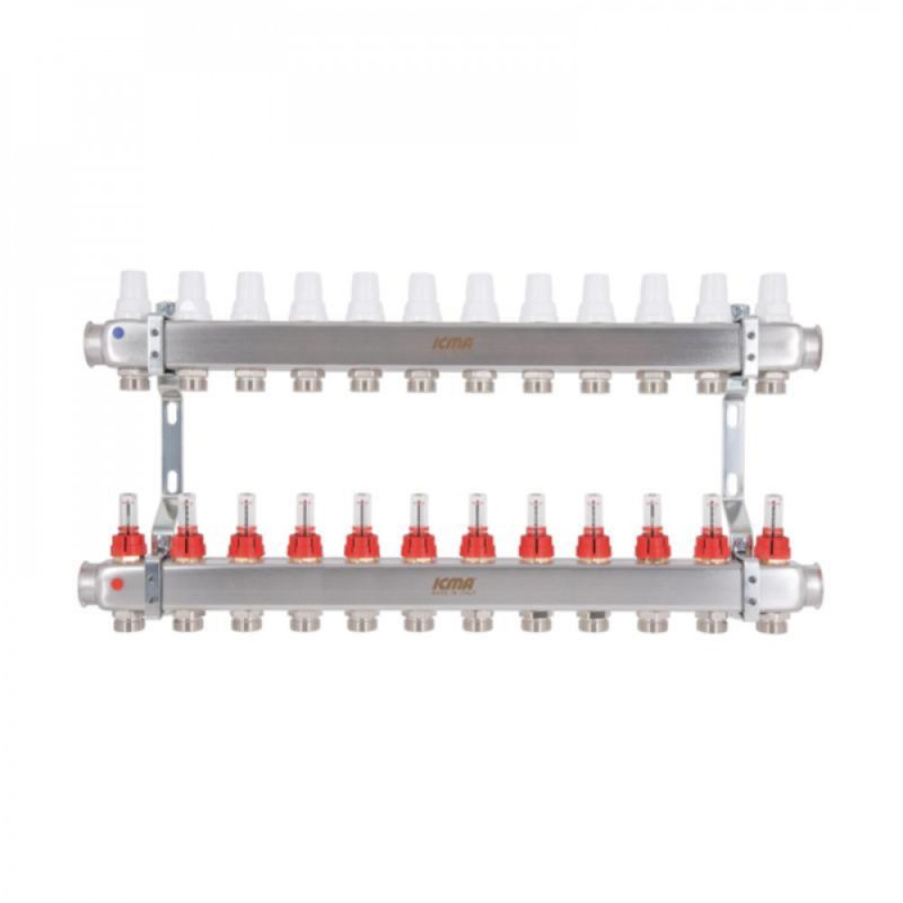 Колектор із нержавіючої сталі Icma № K073 з витратомірами забезпечує точний розподіл теплоносія в системах опалення. Оснащений швейцарськими витратомірами Taconova, які гарантують високу точність і якість контролю потоку. Оновлена конструкція зручного кріплення спрощує монтаж, забезпечуючи надійну та швидку установку.