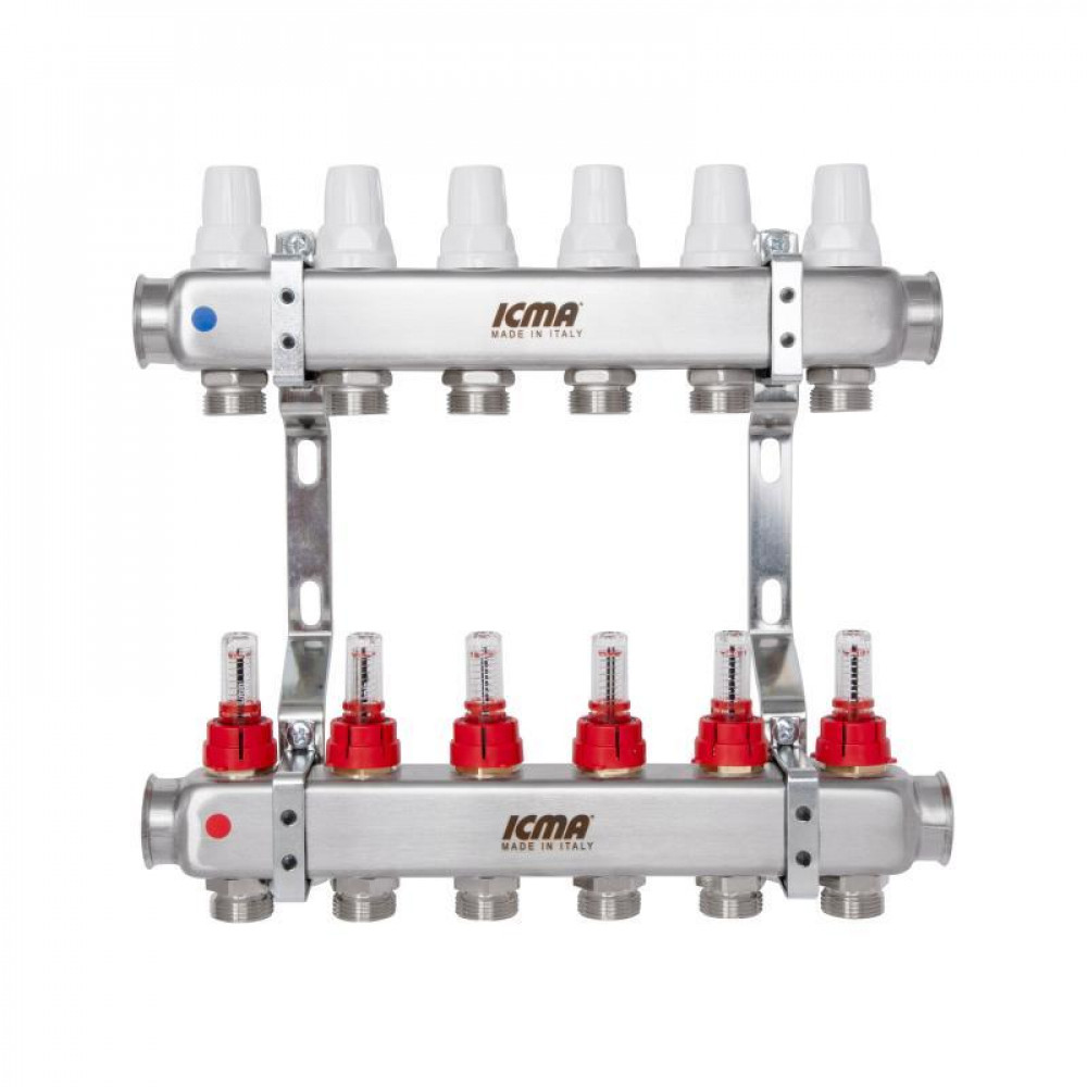 Колектор із нержавіючої сталі Icma № K073 з витратомірами забезпечує точний розподіл теплоносія в системах опалення. Оснащений швейцарськими витратомірами Taconova, які гарантують високу точність і якість контролю потоку. Оновлена конструкція зручного кріплення спрощує монтаж, забезпечуючи надійну та швидку установку.