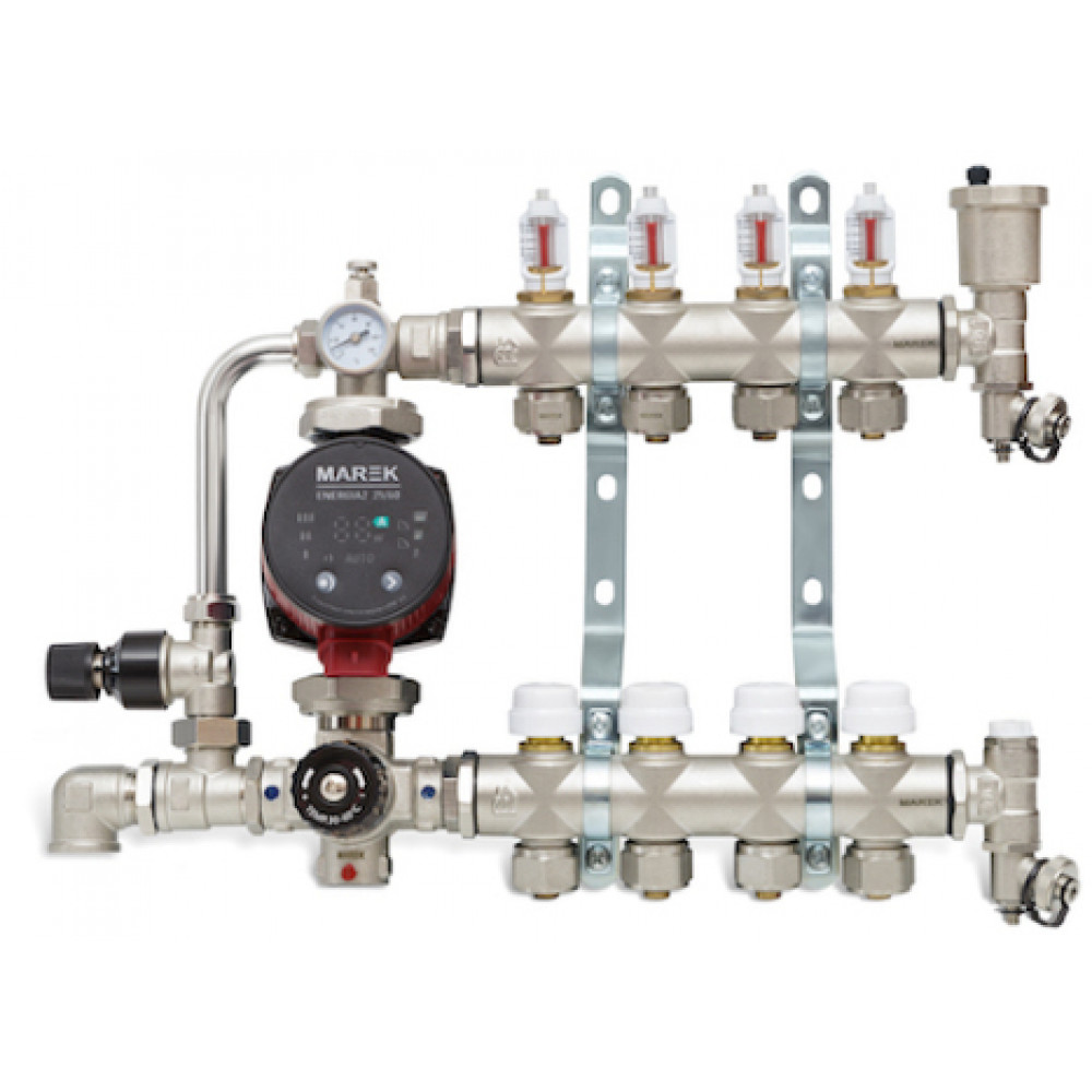Колекторна група для теплої підлоги MAREK у складі з витратами дає змогу розподіляти та балансувати теплоносія в системах опалення з теплими підлогами. Максимальна робоча температура — 90 °C, Максимальний тиск — 8 барів. Комплектація Колектор для підлоги MAREK з кронштейнами та євроконусами. Змішувальна група MAREK MX01 1" х 3/4" Частотний циркуляційний насос MAREK ENERGIA2 25/60-130 Зливна група з автоматичним розріджувачем MAREK Зливна група з ручним розріджувачем MAREK