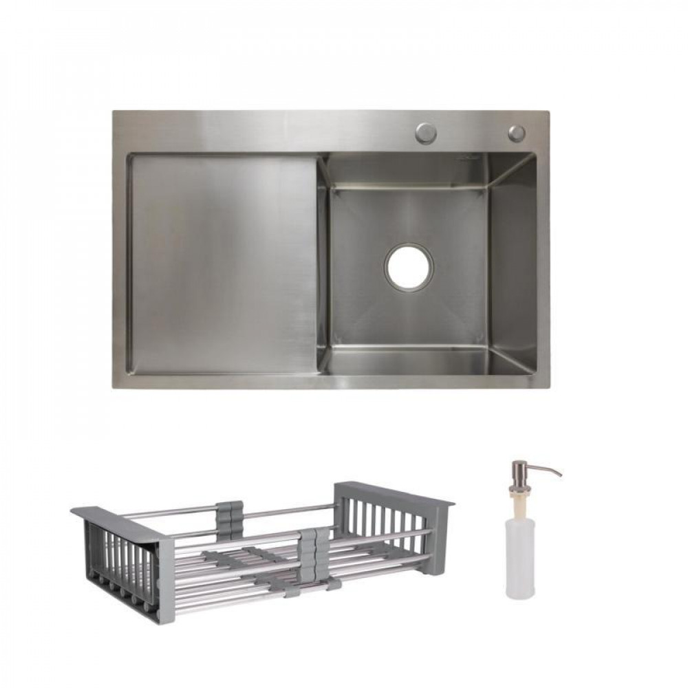 Комплект Lidz Handmade H7849L (Brushed) пропонує збільшену мийку з лівим крилом, фінішем Brushed, дозатором для мийного засобу та кошиком Lidz K01G. Ідеальний вибір для великих кухонь.
