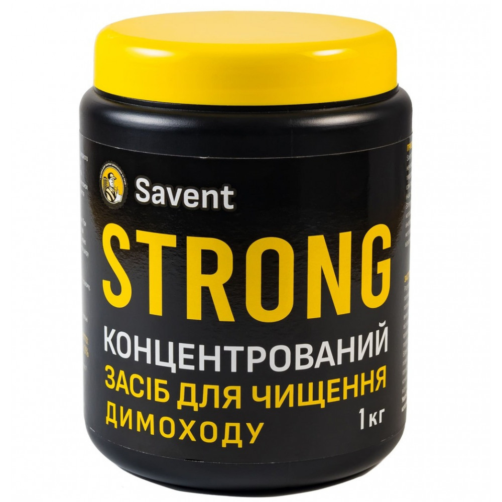Savent Strong 1кг – концентрований порошок нового покоління для немеханічного видалення сажі та смолистих відкладень у димоходах та твердопаливних приладах. Каталітична дія засобу направлена на розпушення сажі та смол і перетворення їх на попіл, частина якого вилітає через димохід, а інша – осідає на дно камери згорання. Завдяки своїм властивостям, Savent Strong сприяє збільшенню ККД, продовженню терміну служби димоходу та котла або каміна, економії палива від 10 до 20 відсотків і зменшенню ймовірності займання димоходу. Засіб призначений для очистки цегляних та металевих димоходів, твердопаливних котлів, пічок, печей-камінів, камінів відкритого та закритого типу. Застосування: Розтопіть опалювальний прилад та прогрійте його. Після години горіння палива додайте засіб у палаючий вогонь із розрахунку 1 мірна ложка на 10 кг палива. Для зручності можна насипати засіб на папір, потім згорнути його і вкинути у вогонь. Кількість порошку визначається індивідуально та залежить від вологості та сорту дров, товщини сажі та смоли в димоході. Слід враховувати, що для забрудненого димоходу та вологих дров потрібно більше порошку.