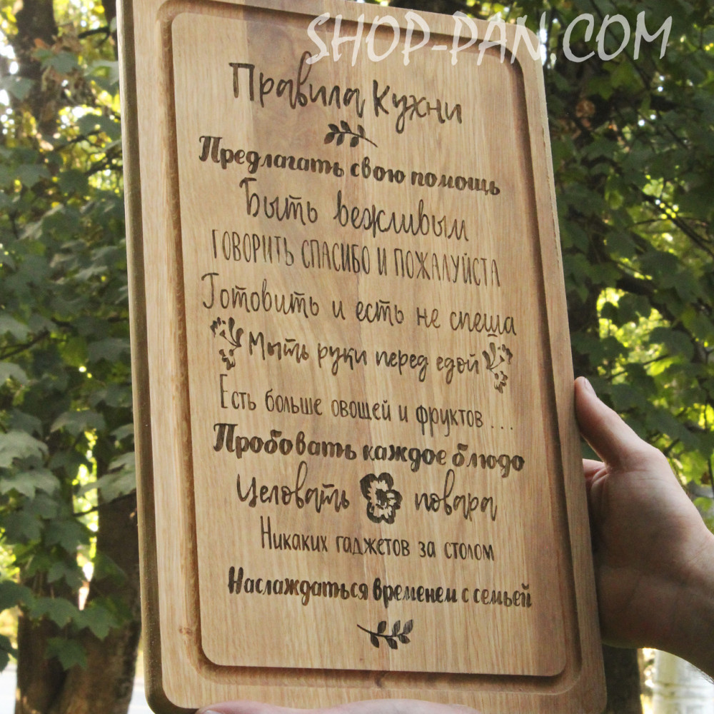 Кухонна дошка з гравіруванням правила кухниКухонна дошка з вашим гравіюванням. що може бути незвичайніше? Друзі! Тепер у нас є і таке, ми не будемо переставати додавати в наш асортимент нові види продукції, адже ми вас любимо і цінуємо, тому хочемо робити для вас більше крутих пропозицій. На дошку можна нанести будь-який текст привітання або малюнок. І ваша дошка буде вже точно в єдиному екземплярі! З вас креатив (картинка, текст, логотип) що найкраще характеризує майбутнього власника. З нас - реалізація! Підійде для всіх! Навіть для тих, хто не вміє готувати, тому що з такою дощечкою гріх не навчитися :) ???? Shop-Pan – ваш прямий постачальник туристичного спорядження та ексклюзивних аксесуарів для дому та відпочинку Пропонуємо широкий асортимент товарів для туризму, кемпінгу, риболовлі та пікніків – якісні вироби, перевірені часом та зібрані з любов'ю до деталей. ???? Широкий асортимент продукції У нашому каталозі представлені: ✅ Туристичні сковороди, турбо-пічки, котли, коптильні, ножі, рибальські сумки, ліхтарі та багато іншого ✅ Надійні товари для активного відпочинку, будинки та кухні – все для зручності та натхнення. ✅ Рішення для будь-якого стилю життя - від походів до домашнього затишку ✅ Збалансований вибір: еко-продукція з дерева, кухонні гравівальні дошки, фартухи з вашим принтом, монастирі, мангали, шампури, годинники та постери ✅ Аксесуари з можливістю персоналізації – зробіть свій подарунок унікальним ✅ Якість, естетика та турбота в кожному виробі – без прихованих недоліків та компромісів ???? Професійні консультації Менеджери проконсультують щодо вибору товарів. Працюємо: Пн-Пт 10:00 – 18:00, Сб 11:00 – 16:00. Зв'язок: Viber, Telegram, WhatsApp. ???? Швидка доставка по Україні ???? Замовлення, оформлені до 16:00, надсилаються того ж дня. ???? Доставка найпопулярнішими службами України ???? Бонуси та знижки за відгуки! ???? ???? Оцініть якість товару та ГАРАНТОВАНО отримайте знижку або безкоштовну доставку на замовлення! ???? Нам особливо цінні фото- та відеовідгуки. ???? Повідомте про свій відгук менеджеру в Telegram, WhatsApp або Viber (на вибір) - і гарантовано отримайте приємний бонус! ???? Знайдіть нас у Google - "Shop-Pan" і ознайомтеся зі _______________________________ Чому обирають нас? ???? ✅ Якість, якій можна довіряти Практичні товари для дому, подорожей та активного відпочинку ✅ Зважений підхід, чесність та контроль якості на кожному етапі виготовлення ???? Від ексклюзивних сувенірів до туристичного спорядження – все для ваших цілей та подарунків ✅ Замовлення 24/7 - просто та швидко! ???? Наш сайт працює 24/7 ???? Менеджер відповість у месенджерах у зручний для вас час. ✅ Швидка доставка по Україні ???? Працюємо по всій Україні! ???? Розрахуємо вартість та підберемо зручний спосіб оплати. Отримайте посилку швидко та без клопоту. _______________________________ Як замовити? Простий алгоритм покупки: ✔ Оформіть замовлення через кошик або у месенджерах ✔ Ми зв'яжемося з вами для уточнення деталей ✔ Відправимо після оплати або післяплатою ✔ Отримайте замовлення у найближчому відділенні ???? "Shop-Pan" - Магазин, якому довіряють тисячі клієнтів, які цінують якість та оригінальність! ????Ми цінуємо кожного клієнта та гарантуємо відмінний сервіс та продукцію. ???? Зробіть замовлення зараз!