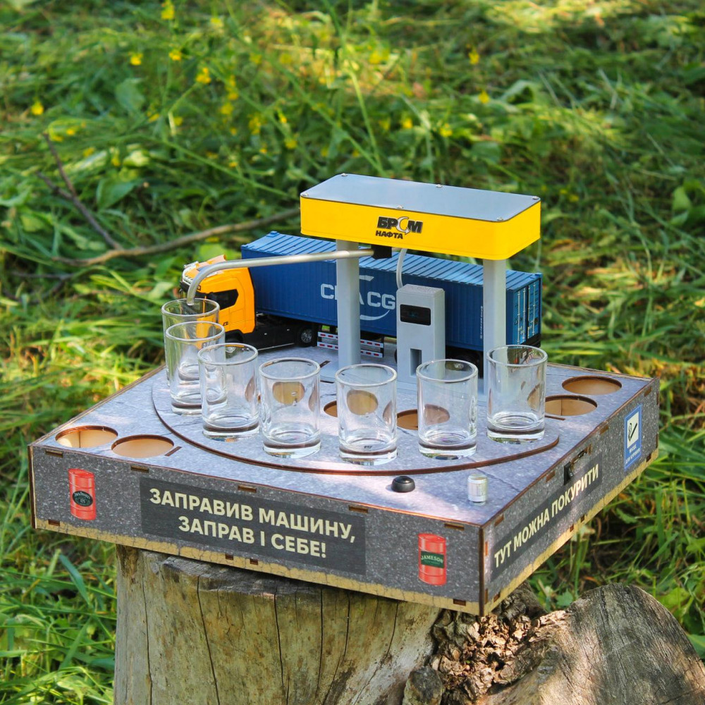 Наливатор у вигляді іграшки - АЗС БРСМ - це функціональний механічний пристрій, призначений для дозування спиртного. Апарат здійснює розлив напою, кількість рідини, що наповнюватиме ємність, регулюється. Наливатор стане оригінальним подарунком для любителів ексклюзиву. Характеристики: Дизайн: АЗС БРСМ Кількість чарок: 7 Об'єм чарок: 50 мл Живлення: USB-кабель Матеріал: пластик, фанера, шланга харчова Функції: Регулювання об'єму напою Додатково можна придбати: Гравірування на чарках Повербанк 5000 мА / 10000 мА Вбудований акумулятор