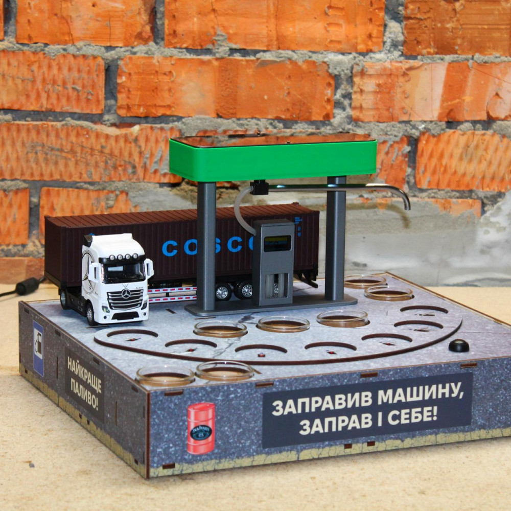 Наливатор у вигляді іграшки - АЗС - це функціональний механічний пристрій, призначений для дозування спиртного. Апарат здійснює розлив напою, кількість рідини, що наповнюватиме ємність, регулюється. Наливатор стане оригінальним подарунком для любителів ексклюзиву. Характеристики: Дизайн: АЗС Кількість чарок: 7 Об'єм чарок: 50 мл Живлення: USB-кабель Матеріал: пластик, фанера, шланга харчова Функції: Регулювання об'єму напою Додатково можна придбати: Гравірування на чарках Повербанк 5000 мА / 10000 мА Вбудований акумулятор