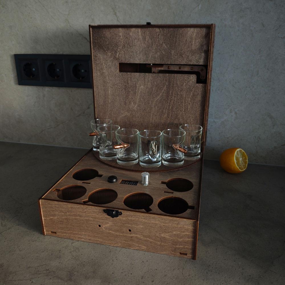 Характеристики: Кількість чарок: 6 Об'єм чарок: 50 мл Живлення: USB-кабель Матеріал: фанера, шланга харчова Функції: Регулювання об'єму напою Додатково можна придбати: Повербанк 5000 мА / 10000 мА Вбудований акумулятор