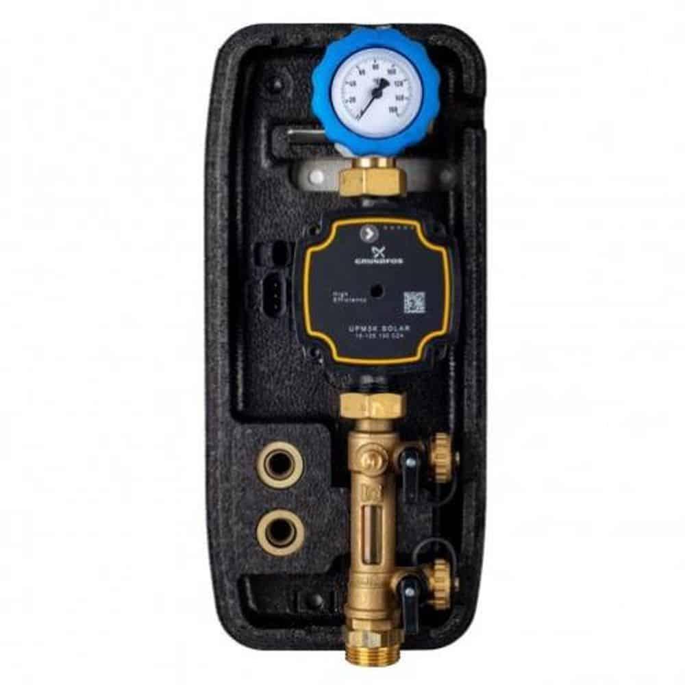 divОднолінійні помпові групи для геліосистем з високоефективними циркуляційними помпами з ШІМ керуванням./divdivНа зворотній лінії встановлено 3-х ходовий кульовий кран із вбудованим зворотним клапаном і термометром (0-160 °С); спеціально розроблений для геліосистем високоефективний циркуляційна помпа Grundfos UPM3 Solar з ШІМ керуванням; група безпеки (6 бар) з манометром (0-10 бар) з виходом (1"НР) для розширювального бака; витратомір (1-6, 2-12, 8-28, 8-38 л / хв) з регулятором протоки та кранами для зливу / заповнення системи./divdiv/divdivПомпові групи укомплектовані теплоізоляційним кожухом з можливістю установки мікро контролера. Максимальна робоча температура 150 ° C./div