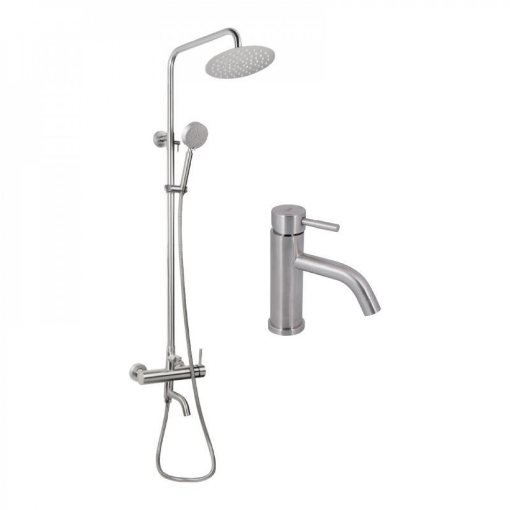Практичное решение для ванной комнаты: компактный смеситель для раковины и душевая система с изливом в три потребителя. Оба изделия выполнены в никелевом покрытии и обеспечивают надежность в эксплуатации.