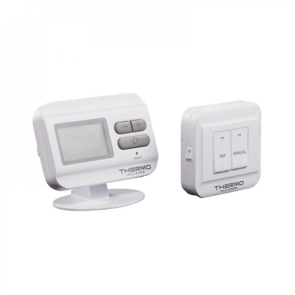 Дневной термостат Thermo Alliance ТА-2301RF имеет два блока: блок управления отопительным прибором (включение/выключение) и блок комнатного термостата, он используется как графический пользовательский интерфейс для определения и контроля температуры в помещении. Оба блока поддерживают связь радиочастотами (RF).