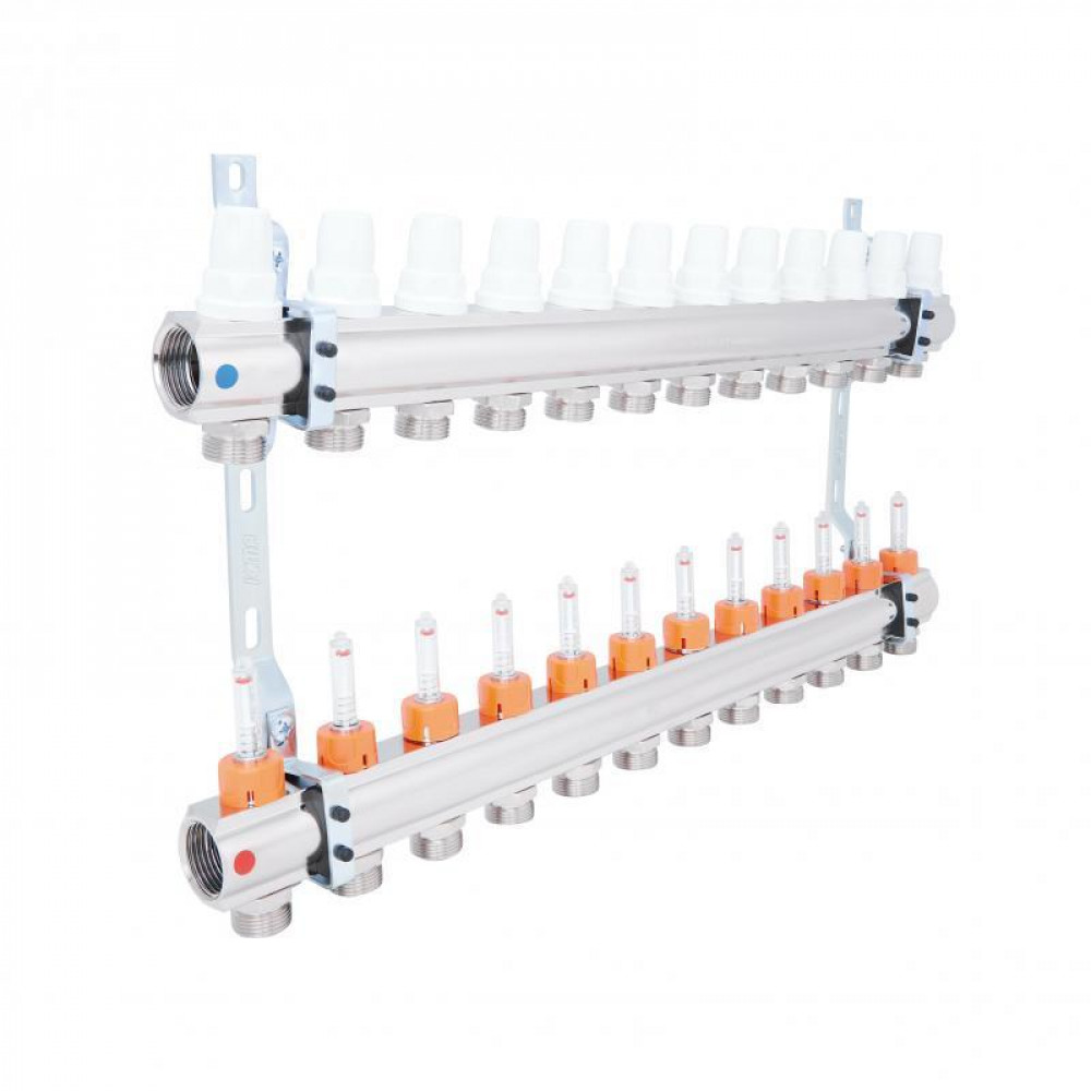 Коллектор ICMA Арт. K013 предназначен для распределения тепловой энергии в системе теплого пола. Данная установка применяется в системах отопления полов. Коллектор позволяет равномерно распределять теплоноситель. Теплоноситель поступает из первичного контура и должен быть подготовлен температуры, не превышающей 55°C. Данный коллектор имеет 12 выходов.