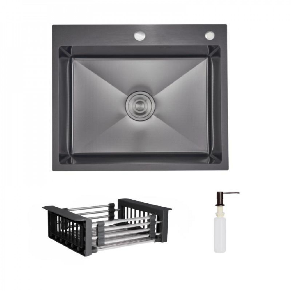 Интегрированная мойка из нержавеющей стали с эффектным черным покрытием Black PVD и рельефным рисунком Honeycomb. В наборе — дозатор и корзина Lidz K01G для полного комплекта кухонной оснастки.