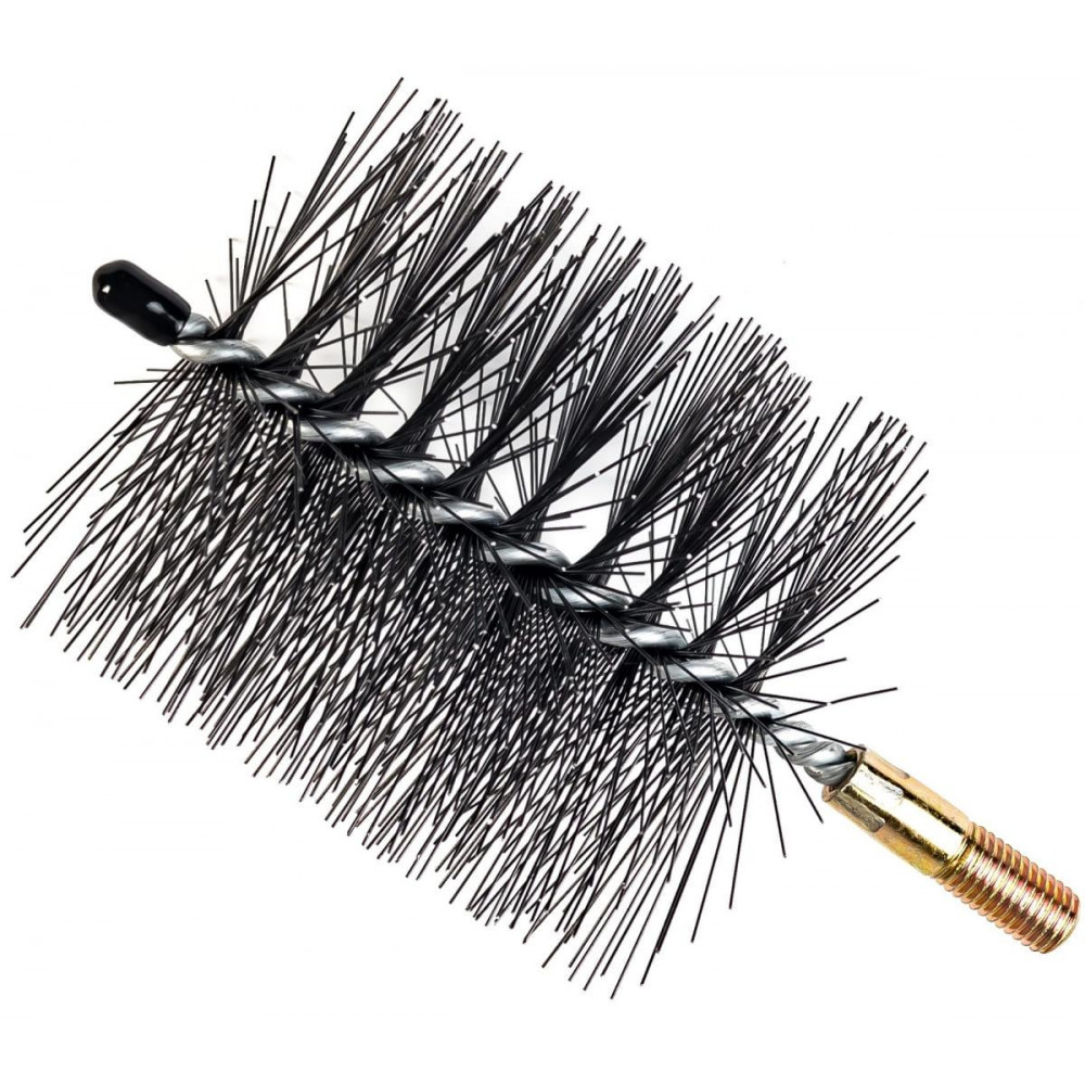 Під час експлуатації твердопаливних котлів, камінів і печей на стінках димоходу та камери згоряння поступово накопичуються сажа, смола та інші відкладення. Такі забруднення знижують тягу, ефективність роботи опалювальних приладів, можуть спричинити займання сажі або потрапляння чадного газу в приміщення. Регулярна перевірка тяги, ступеня забруднення та своєчасне очищення димоходу допоможуть уникнути цих небезпечних ситуацій. Щітка металева Ecodym 100 мм призначена для ефективного очищення стінок димохідних труб від сажі, смоли та інших відкладень. Щетина виконана з пружинного дроту, загартованого в маслі, діаметром 0,55 мм, який надійно затиснутий між двома оцинкованими прутами діаметром 3,8 мм. Щітка має різьбу М12 для зручного кріплення до гнучкої ручки. Завдяки міцній і водночас гнучкій конструкції металева щітка дозволяє швидко й якісно очищати димові канали будь-якого типу, окрім димоходів із нержавіючої сталі. Для запобігання пошкодженню таких димоходів рекомендується використовувати пластикову щітку.