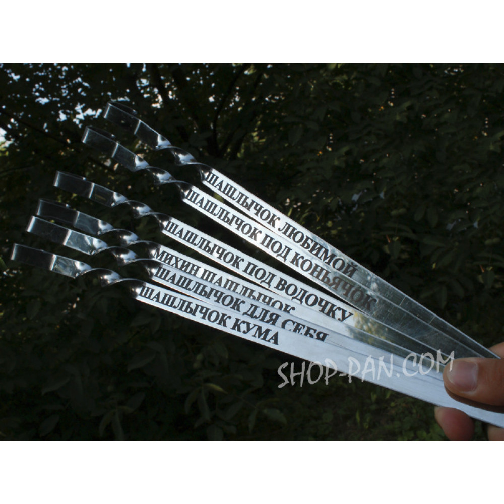 Шампура з гравіюванням 10 шт.Шанувальникам польової кухні не обійтися без якісних шампурів для приготування шашлику. У нашому інтернет-магазині замовте подарунковий набір шампурів із гравіюванням для себе та друзів! Пропонуємо вироби високої якості, виготовлені з безпечного та міцного матеріалу. Щоб зробити подарунок ексклюзивним і незабутнім, замовте гарну дерев'яну коробку, на яку ми також наносимо написи або зображення. Фото гравіювання на шампурах і коробці дивіться на сайті. Нанесення індивідуального гравіювання на шампури швидко та недорого Придумайте свій напис, щоб зробити подарунок унікальним. Це може бути найменування, ініціативи, будь-яка фраза або фірмовий слоган, жарт або побажання. Не знаєте, яку фразу вибрати для гравіювання на шампурах, що написати? Проконсультуйтеся з менеджером магазину та виберіть готовий варіант із представлених на сайті. На подарункову коробку також наноситься індивідуальне гравіювання. Прикрасити виріб можна не тільки фразою, але й оригінальним малюнком. Якісне лазерне гравіювання зберігає ідеальний вигляд під час експлуатації виробу, не потребує догляду. Особливості та переваги наших товарів Термін експлуатації шампурів залежить не тільки від інтенсивності та частоти використання, але й матеріалу, з якого вони виготовлені. Наші вироби виготовлені з міцної й безпечної сталі. Метал не деформується під впливом високих температур, зберігає ідеальну форму, не виділяє шкідливих речовин під час нагрівання. Шампури класичної форми можна використовувати для приготування шашлику на будь-якому мангалі, звичайному або вертикальному. Різноманітність якісних і довговічних мангалів представлена в каталозі нашого магазину. Переваги продукції: Привабливий зовнішній вигляд; Зручність використання; Тривалий термін експлуатації; Міцність; Безпека; Універсальність. Рекомендації щодо догляду за виробами Готувати м'ясо приємно на чистих шампурах, що мають акуратний зовнішній вигляд. Щоб виріб не псується, ретельно очищайте його після кожного застосування. Мийте вироби звичайними мийними засобами для посуду та м'якими губками. Відмовтеся від металевих шкребків, лужних і абразивних засобів, які залишають подряпини на поверхні. Щоб швидко та просто видалити пригорілі залишки шашлику, замочіть девайси в гарячій воді, зачекайте, поки вона охолоне, промийте та витріть насухо. Зберігайте комплект у сухому місці. Захисний чохол з брезенту легко чиститься, за потреби переться. Подарункова коробка не потребує догляду. Купити шампури з гравіюванням із доставкою за доступною ціною Виготовляє продукцію відповідно до високих стандартів якості. Пропонуємо різноманітність товарів для кемпінгу та приготування смачних страв на багатті. Гравірування наносимо на інші вироби: чарки, кришки для сковорідок із диска борони, мангали. З асортиментом ознайомтеся на сайті. Щоб замовити комплект, додайте його в кошик, не забудьте вказати свої контактні дані. найближчий час після відправлення заявки з вами зв'яжеться наш менеджер, відповість на всі цікаві питання та уточнить деталі замовлення. Доставляємо товари в Україні в стислі терміни, гарантуємо відповідність продукції описом на сайті. Важливо! Ціна набору підвищується на 20%, якщо гравіювання на шампурах відрізняється. ???? Shop-Pan – ваш прямий постачальник т