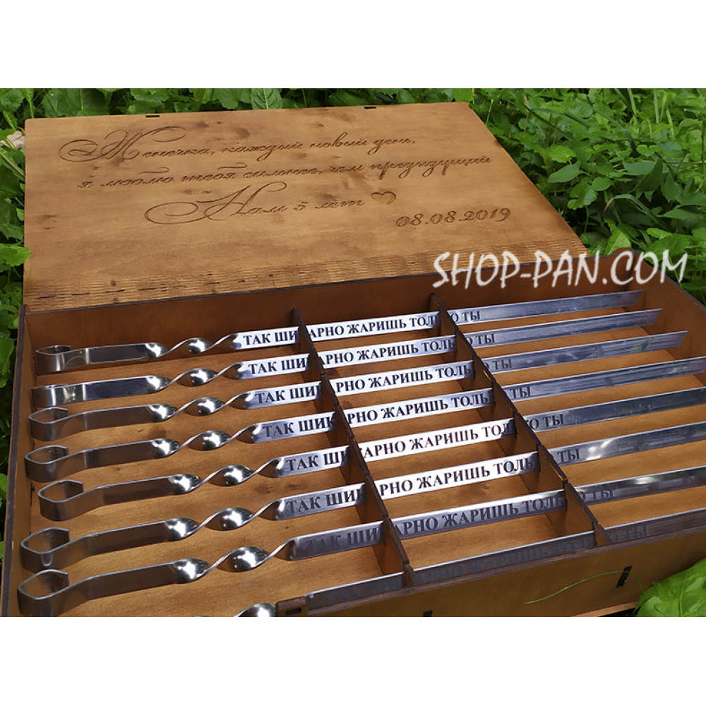 Шампура з гравіюванням 12 шт.Набір шампурів із гравіюванням — чудовий подарунок для всіх, хто любить готувати на природі, часто відпочиває за містом. У нашому магазині замовте вироби за найкращою ціною! Пропонуємо комплект, у яких входять 12 шампурів і гарна подарункова коробка, виготовлена з дерева. Наносимо лазерне гравіювання на вироби. Прикрасити шампури можна будь-яким написом. На кришку дерев'яної коробки також наноситься гравіювання у формі фрази або малюнка. Фото гравіювання на шампурах і коробці представлені на сайті. Що написати: гравіювання на шампурах на вибір замовника Наші клієнти замовляють вироби з оригінальними написами та фразами. За допомогою сучасного обладнання ми наносимо на метал імена, назви, побажання. Використовуємо кілька різновидів шрифтів. На всі елементи комплекту може бути нанесена одна фраза або різні. Вартість набору підвищується на 20%, якщо гравіювання відрізняється. Дерев'яна коробка прикрашається лазерним гравіюванням, наносяться не тільки фрази, а й зображення. Деталі уточніть у консультанта магазину по телефону, зазначеному на сайті. Переваги нашої продукції Продаємо товари, виготовлені з безпечних матеріалів. Наші шампури виготовлені з міцної сталі. Матеріал не псується під впливом високих температур, безпечний для здоров'я, не виділяє токсичних речовин. Форма виробів — класична. Можна використовувати для приготування м'яса на мангалі будь-якого типу. Зверніть увагу, у каталозі є моделі не тільки з металевими, але й дерев'яними ручками. Переваги товарів: Висока якість матеріалів; Міцність і довговічність; Безпека для здоров'я; Універсальність; Класична форма; Зручність використання; Доступна ціна. Поради щодо догляду Шампури прості у використанні та не вимагають спеціального догляду. Щоб вони завжди були в ідеальному стані, досить своєчасно очищати від забруднень. Після кожного застосування рекомендуємо ретельно мити вироби м'якою губкою для посуду та звичайним мийним засобом. Щоб видалити залишки пригорілих продуктів і кіптяву, не потрібно чистити поверхню металевими шкребками. Жорсткі щітки, абразивні та лужні мийні засоби псують матеріал, залишаючи на ньому подряпини. Просто замочіть девайси в гарячій воді, коли вона охолоне, доставте та промийте, витріть насухо рушником або серветками. Ретельно вимийте та витріть перед тривалим зберіганням. Рекомендуємо зберігати вироби в сухому місці. Дерев'яну коробку можна очистити водою і м'якою губкою, застосування мийних засобів не рекомендоване. Купити шампури з гравіюванням за доступною ціною У нашому магазині представлені доступні та якісні товари для кемпінгу. Пропонуємо великий вибір похідного посуду, аксесуари для нього, пристосування, які зроблять ваш відпочинок максимально комфортним і приємним. Наносимо індивідуальне гравіювання на шампури та інші товари, наприклад, на сталеві кришки для сковорідок із диска борони, розбірні мангали, металеві похідні чарки та підставки для них. Оформіть замовлення на сайті й отримайте свої товари в стислі терміни. Гарантуємо високу якість продукції та відповідність опису. За докладною інформацією зверніться до консультантів магазину. ???? Shop-Pan – ваш прямий постачальник туристичного спорядження та ексклюзивних аксесуарів для дому та відпочинку Пропонуємо широкий асортимент товарів д