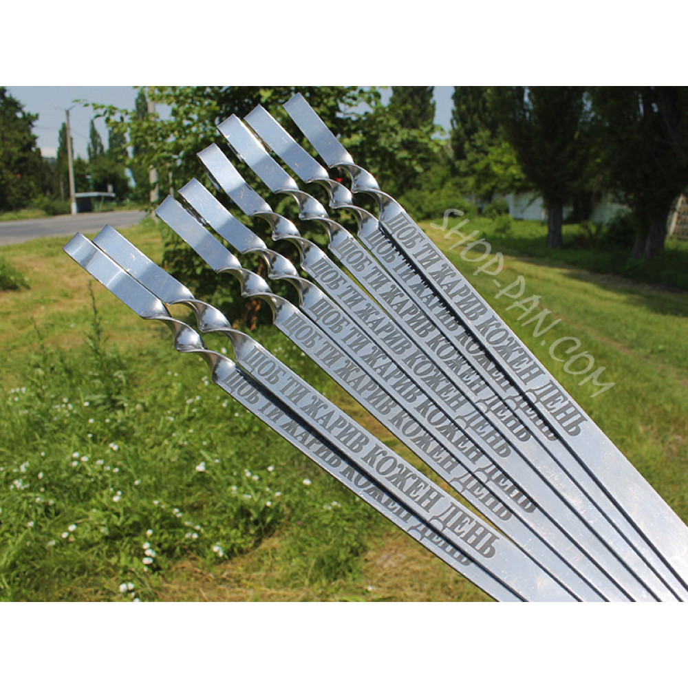 Шампура з гравіюванням 6 шт.Ви давно чекали на комплекти шампурів із гравіюванням, і тепер вони є в нашому магазині. Вибирайте відповідний набір для себе та друзів! Наші шампури виготовлені з міцного та довговічного матеріалу, безпечного для здоров'я, слугуватимуть вам дуже довго. Це чудовий подарунок або покупка для себе, яка щоразу тішитиме та підніматиме настрій. Для оздоблення виробів виберіть будь-яку фразу. Це може бути жарт або побажання, ім'я, фірмовий слоган. Пропонуємо великий каталог готових шаблонів, а також виконуємо індивідуальні замовлення. Висока якість за найкращою ціною Набір шампурів ніколи не буде зайвим. Якщо ви часто їздите на пікнік або риболовлю, відпочиваєте великою компанією, замовте комплект із 6 шт. За бажанням клієнта прикрашаємо коробки, на них також наносимо всілякі написи, зображення та логотипи. Наші переваги: Бездоганна якість товарів; Індивідуальний підхід; Швидке виконання замовлень; Привабливі ціни; Великий асортимент ескізів. Купіть шампури з гравіюванням для себе або в подарунок. Ми в стислі терміни наносимо на поверхню металу різноманітні написи, гарантуємо найкращу якість. Гравіювання на шампури наноситься максимально акуратно. Не знаєте, що написати? Проконсультуйтеся з менеджером магазину та виберіть потрібний варіант із готових шаблонів, представлених на фото. Поради щодо використання шампурів із гравіюванням Секретів, як правильно використовувати набір шампурів із гравіюванням, немає. Це максимально простий товар, і кожен знає, як ним користуватися. Головне — не забувайте ретельно доглядати вироби. Щоб шампури з індивідуальним гравіюванням якомога довше зберігали акуратний зовнішній вигляд, рекомендуємо чистити їх після кожного застосування. Мити можна будь-яким мийним засобом і губкою. Щоб не довелося використовувати жорстку металеву мочалку, після якої на поверхні металу залишаються подряпини, замочіть вироби в теплій воді перед очищенням. Подарункова дерев'яна коробка також не потребує особливого догляду. Якщо вона забруднена, використовуйте м'яку губку та мильний розчин для очищення. Більше корисних товарів для кемпінгу та кулінарних експериментів на природі ви знайдете в каталозі нашого інтернет-магазину. Пропонуємо великий вибір якісної та доступної продукції, швидко доставляємо товари до всіх регіонів України. Більше різноманітних і смачних страв ви можете приготувати на наших сковородах із диска борони. Сковорідки мають плоску та рівну поверхню, продукти на них просмажуються рівномірно, не підгоряють, страви виходять соковитими й ароматними. Пропонуємо й інші товари з гравіюванням і написами: кришки для сковорідок із диска борони, металеві чарки, підставки під рюмки, дерев'яний віял для роздування вогню, чохол для мангала або сковороди. Ми маємо все для комфортного відпочинку за містом, ознайомтеся з асортиментом на сайті. Потрібна допомога у виборі? Проконсультуйтеся з менеджером магазину по телефону, і фахівець відповість на питання, що цікавлять. ???? Shop-Pan – ваш прямий постачальник туристичного спорядження та ексклюзивних аксесуарів для дому та відпочинку Пропонуємо широкий асортимент товарів для туризму, кемпінгу, риболовлі та пікніків – якісні вироби, перевірені часом та зібрані з любов'ю до деталей. ???? Широкий асортимент продукції У нашому каталоз