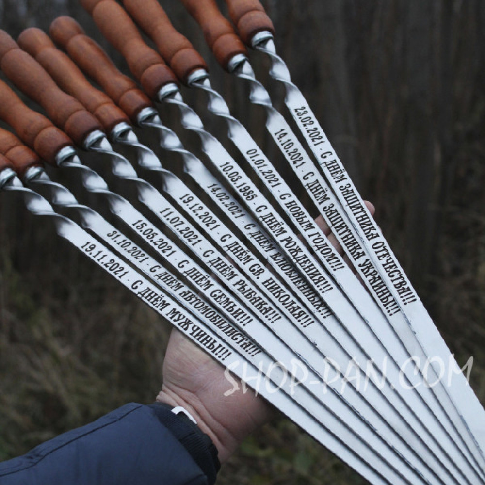 Шампури з дерев'яними ручками та гравіюванням 10 шт (одинакове гравіювання на всіх шампурах)Шанувальникам польової кухні не обійтися без якісних шампурів для приготування шашлику. У нашому інтернет-магазині замовте подарунковий набір шампурів із дерев'яними ручками та гравіюванням для себе та друзів! Пропонуємо вироби високої якості, виготовлені з безпечного та міцного матеріалу. Щоб зробити подарунок ексклюзивним і незабутнім, замовте гарну дерев'яну коробку, на яку ми також наносимо написи або зображення. Фото гравіювання на шампурах і коробці дивіться на сайті. Для зручного зберігання і транспортування пропонуємо додатково замовити чохол, його вартість — 140 гривень. Чохол виготовлений зі щільного та міцного брезенту. Нанесення індивідуального гравіювання на шампури з дерев'яними ручками швидко та недорого Придумайте свій напис, щоб зробити подарунок унікальним. Це може бути найменування, ініціативи, будь-яка фраза або фірмовий слоган, жарт або побажання. Не знаєте, яку фразу вибрати для гравіювання на шампурах, що написати? Проконсультуйтеся з менеджером магазину та виберіть готовий варіант із представлених на сайті. На подарункову коробку також наноситься індивідуальне гравіювання. Прикрасити виріб можна не тільки фразою, але й оригінальним малюнком. Якісне лазерне гравіювання зберігає ідеальний вигляд під час експлуатації виробу, не потребує догляду. Особливості та переваги наших товарів Термін експлуатації шампурів залежить не тільки від інтенсивності та частоти використання, але й матеріалу, з якого вони виготовлені. Наші вироби виготовлені з міцної й безпечної сталі. Метал не деформується під впливом високих температур, зберігає ідеальну форму, не виділяє шкідливих речовин під час нагрівання. Шампури з дерев'яними ручками класичної форми можна використовувати для приготування шашлику на будь-якому мангалі, звичайному або вертикальному. Різноманітність якісних і довговічних мангалів представлена в каталозі нашого магазину. Переваги продукції: Привабливий зовнішній вигляд; Зручність використання; Тривалий термін експлуатації; Міцність; Безпека; Універсальність. Рекомендації щодо догляду за виробами Готувати м'ясо приємно на чистих шампурах, що мають акуратний зовнішній вигляд. Щоб виріб не псується, ретельно очищайте його після кожного застосування. Мийте вироби звичайними мийними засобами для посуду та м'якими губками. Відмовтеся від металевих шкребків, лужних і абразивних засобів, які залишають подряпини на поверхні. Щоб швидко та просто видалити пригорілі залишки шашлику, замочіть девайси в гарячій воді, зачекайте, поки вона охолоне, промийте та витріть насухо. Зберігайте комплект у сухому місці. Захисний чохол з брезенту легко чиститься, за потреби переться. Подарункова коробка не потребує догляду. Купити шампури з дерев'яними ручками та гравіюванням із доставкою за доступною ціною Виготовляє продукцію відповідно до високих стандартів якості. Пропонуємо різноманітність товарів для кемпінгу та приготування смачних страв на багатті. Гравірування наносимо на інші вироби: чарки, кришки для сковорідок із диска борони, мангали. З асортиментом ознайомтеся на сайті. Щоб замовити комплект, додайте його в кошик, не забудьте вказати свої контактні дані. найближчий час після відправлення заявки з в