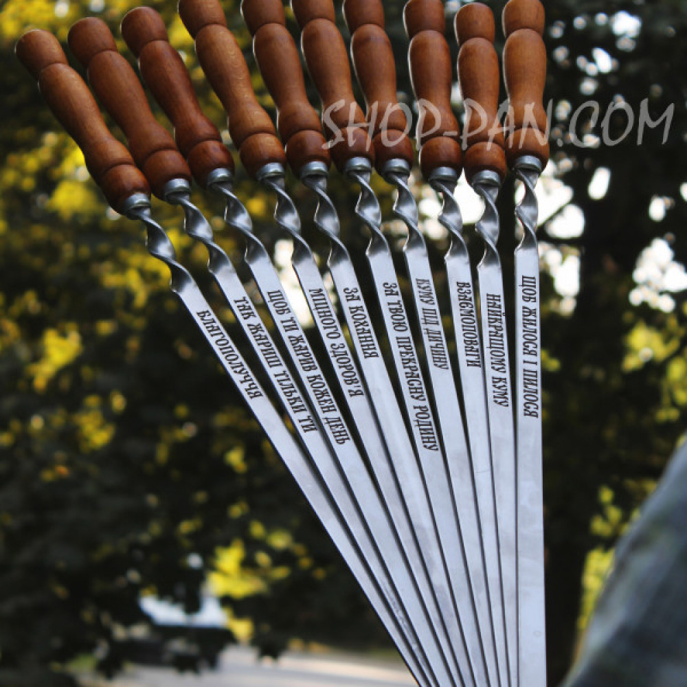 Шампури з дерев'яними ручками та гравіюванням 12 шт (одинакове гравіювання на всіх шампурах)Набір шампурів із дерев'яними ручками та гравіюванням — чудовий подарунок для всіх, хто любить готувати на природі, часто відпочиває за містом. У нашому магазині замовте вироби за найкращою ціною! Пропонуємо комплект, у яких входять 12 шампурів і гарна подарункова коробка, виготовлена з дерева. Наносимо лазерне гравіювання на вироби. Прикрасити шампури можна будь-яким написом. На кришку дерев'яної коробки також наноситься гравіювання у формі фрази або малюнка. Фото гравіювання на шампурах і коробці представлені на сайті. Що написати: гравіювання на шампурах із дерев'яними ручками на вибір замовника Наші клієнти замовляють вироби з оригінальними написами та фразами. За допомогою сучасного обладнання ми наносимо на метал імена, назви, побажання. Використовуємо кілька різновидів шрифтів. На всі елементи комплекту може бути нанесена одна фраза або різні. Вартість набору підвищується на 20%, якщо гравіювання відрізняється. Дерев'яна коробка прикрашається лазерним гравіюванням, наносяться не тільки фрази, а й зображення. Деталі уточніть у консультанта магазину по телефону, зазначеному на сайті. Переваги нашої продукції Продаємо товари, виготовлені з безпечних матеріалів. Наші шампури виготовлені з міцної сталі. Матеріал не псується під впливом високих температур, безпечний для здоров'я, не виділяє токсичних речовин. Форма виробів — класична. Можна використовувати для приготування м'яса на мангалі будь-якого типу. Зверніть увагу, у каталозі є моделі не тільки з металевими, але й дерев'яними ручками. Переваги товарів: Висока якість матеріалів; Міцність і довговічність; Безпека для здоров'я; Універсальність; Класична форма; Зручність використання; Доступна ціна. Поради щодо догляду Шампури прості у використанні та не вимагають спеціального догляду. Щоб вони завжди були в ідеальному стані, досить своєчасно очищати від забруднень. Після кожного застосування рекомендуємо ретельно мити вироби м'якою губкою для посуду та звичайним мийним засобом. Щоб видалити залишки пригорілих продуктів і кіптяву, не потрібно чистити поверхню металевими шкребками. Жорсткі щітки, абразивні та лужні мийні засоби псують матеріал, залишаючи на ньому подряпини. Просто замочіть девайси в гарячій воді, коли вона охолоне, доставте та промийте, витріть насухо рушником або серветками. Ретельно вимийте та витріть перед тривалим зберіганням. Рекомендуємо зберігати вироби в сухому місці. Дерев'яну коробку можна очистити водою і м'якою губкою, застосування мийних засобів не рекомендоване. Купити шампури з дерев'яними ручками та гравіюванням за доступною ціною У нашому магазині представлені доступні та якісні товари для кемпінгу. Пропонуємо великий вибір похідного посуду, аксесуари для нього, пристосування, які зроблять ваш відпочинок максимально комфортним і приємним. Наносимо індивідуальне гравіювання на шампури та інші товари, наприклад, на сталеві кришки для сковорідок із диска борони, розбірні мангали, металеві похідні чарки та підставки для них. Оформіть замовлення на сайті й отримайте свої товари в стислі терміни. Гарантуємо високу якість продукції та відповідність опису. За докладною інформацією зверніться до консультантів магазину. ???? Shop-Pan – ваш прями