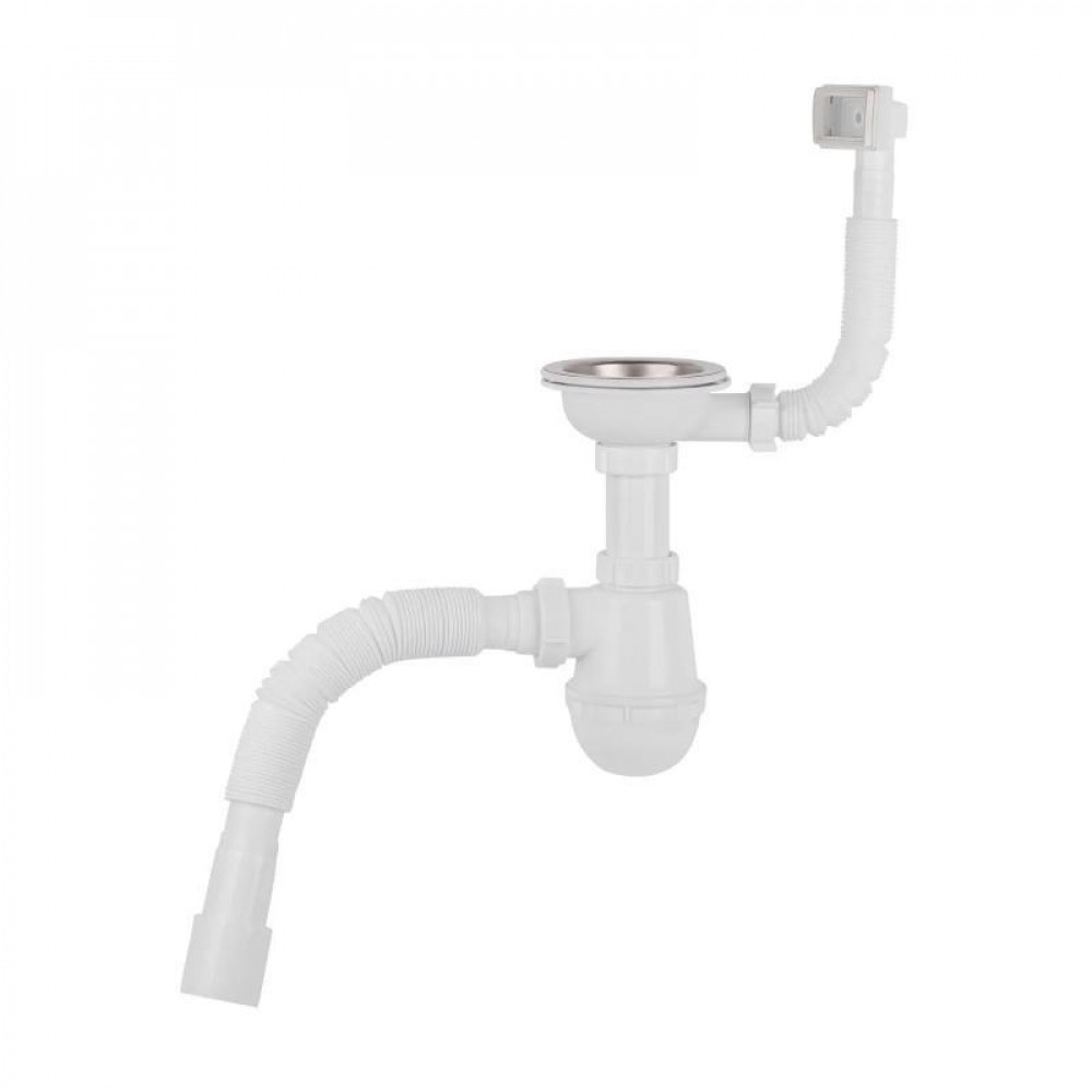 Сифон для кухонної мийки з переливом Lidz (WHI) 60 05 M001 01 виготовлений із пластику білого кольору у вигляді склянки - колби з металевими гратками і гофрованих труб. Резервуар сифона відкручується для очищення. Гофрований вихід дає можливість змінювати довжину і кут труби. Завдяки комунікації для переливу можна уникнути переповнення кухонної раковини водою.
