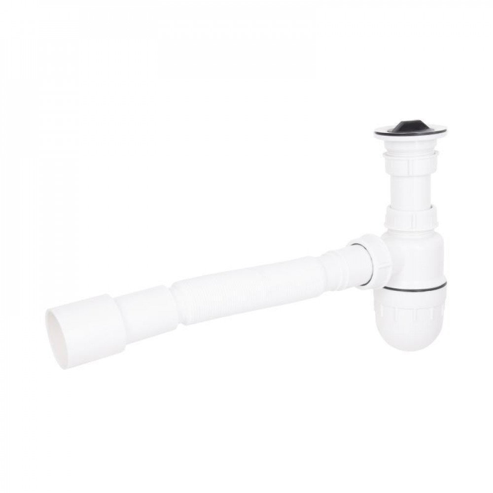 Сифон для раковини Lidz (WHI) 60 06 Y001 00 має вигляд колби виготовлений із пластику білого кольору. Виріб має гладку внутрішню поверхню, що перешкоджає накопиченню бруду на стінках. Резервуар колби легко знімається, тому його очищення від осілих твердих часток не завдасть зайвих клопотів. Гофрований вихід дає можливість змінювати довжину і кут труби.