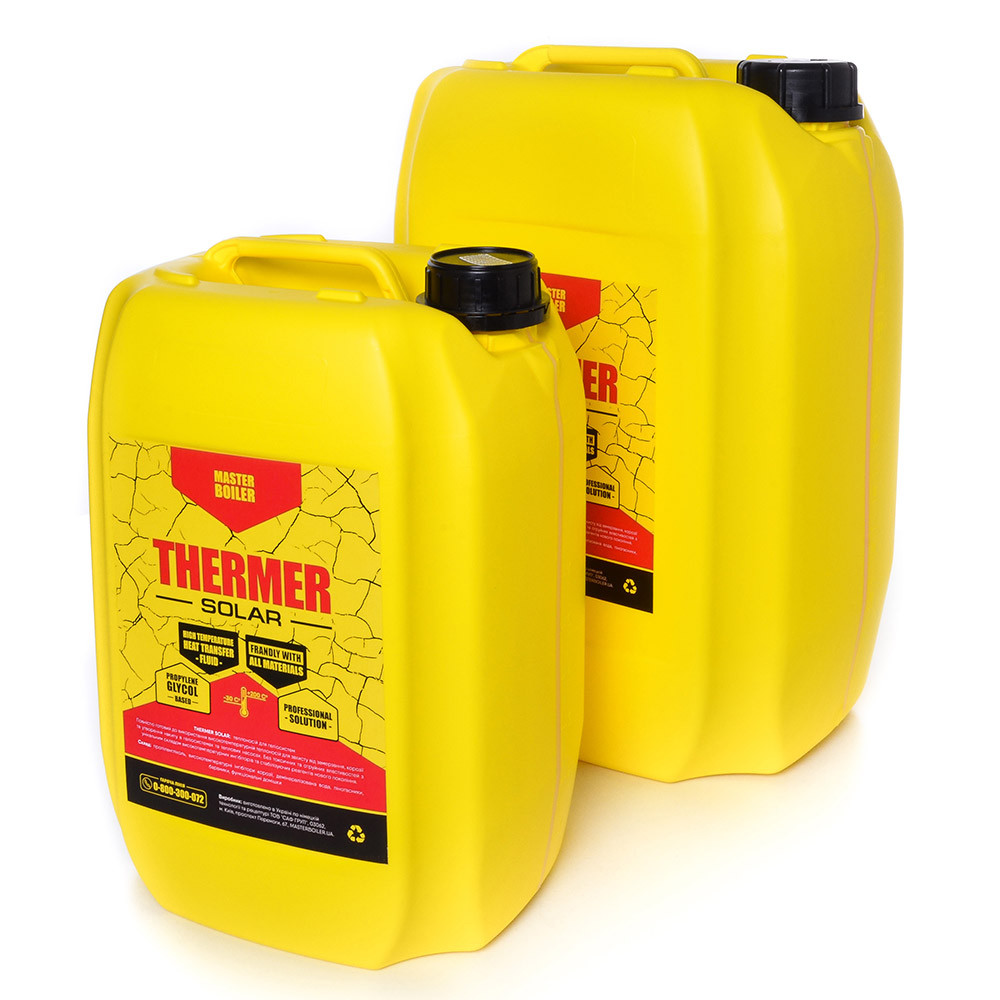 Багатоцільові інгібовані теплоносіки нового покоління, розроблені німецькими фахівцями MASTER BOILER®, за підтримки Інституту неорганічної й аналітичної хімії Технічного університету Клаусталя (Technische Universität Clausthal), у місті Клаусталь-Целерфельд, Німеччина. На цей момент в Україні налагоджено контрактне виробництво основного асортиментного ряду продукції MASTER BOILER ® Рідини для систем опалення й охолодження MASTER BOILER® виробляється у 2 основних серіях DEFENDER® - захисні інгібовані рідини для систем опалення. Не мають незамерзальних властивостей, але призначені для захисту від корозії, накипу та інших відкладень в опалювальних системах. Це ідеальне рішення для заповнення систем після їхнього планового промивання. Також — ідеальне рішення для нових систем опалення. Підходить для металевих і пластикових трубопроводів будь-якого типу, зокрема для систем з алюмінієвими радіаторами опалення. Сумісний з усіма типами опалювальних систем і є найкращим рішенням. Під час використання такого типу теплоносія у Вас не виникне жодних спірних ситуацій із сервісним і гарантійним обслуговуванням опалювальних приладів будь-якого виробника. Більшість торгових марок котлів та іншого опалювального та водонагрівального обладнання знімають із себе гарантійні зобов'язання під час використання незалежних реагентів. У такому разі найкращим теплоносіям буде саме демінералізована вода з додаванням інгібіторів корозії. THERMER® - незамерзальні інгібовані теплоносійки на основі мінерально-водних сумішей, пропіленгліколю й етиленгліколю залежно від серії продукції, призначені для захисту від замерзання, боротьби з корозією, накип'ю, шумом у котлі та виділенням водню у всіх типах систем нагрівання та закритих систем охолодження, зокрема й алюміній (крім серії THERMER® M). Це ідеальний продукт для котлів на біомасі, що вимагають захисту від замерзання. За правильних умов експлуатації, продукт забезпечує постійний захист і не вимагає заміни понад 5 років. Він ідеально підходить для приміщень, де опалювальна система схильна до підвищеного ризику замерзання через розташування, нерегулярне використання або структуру будівлі. Реагенти на основі пропіленгліколю — найуніверсальніші теплоносійники для будь-яких систем, зокрема й для теплових насосів. THERMER® SOLAR: найкращий теплоносій для геліосистем і сонячних колекторів, де необхідні високотемпературні теплоносійки влітку, а взимку важливі високі незамерзальні властивості. Характеристики THERMER® 1) Основа теплоносія DEFENDER® H2O: демінералізована підготовлена вода + німецькі інгібітори нового покоління MASTER BOILER® THERMER® M: на основі мінерально-водного складу (най бюджетніша інгібована композиція для захисту систем, у яких немає алюмінієві матеріали). THERMER® E: на основі етиленгліколю (низькотоксична композиція для захисту від замерзання, найчастіше використовується в системах охолодження й кондиціювання). Через токсичність не підходить для відкритих систем опалення та систем із поганою герметичністю. THERMER® P: на основі пропіленгліколю (найуніверсальніша й найбезпечніша високоінгельована композиція для захисту від корозії та замерзання систем із будь-яких матеріалів) THERMER® SOLAR: на основі пропіленгліколю + присадки з збільшеним діапазоном робочих температур (найкраще рішення для використання у високотемпературних режи