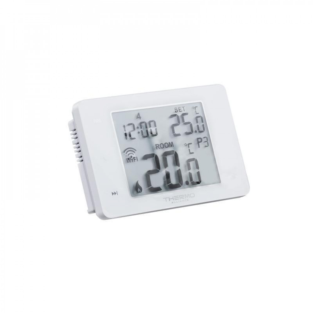 Тижневий програмований термостат Thermo Alliance ТА-2701Wi-Fi підключається до котла за допомогою кабелю та керує процесами увімкнення/вимкнення опалювального приладу по "Сухому Каналу". Блок кімнатного термостата використовується як графічний інтерфейс користувача для визначення та контролю температури в приміщенні. Кабель підключення не входить до комплекту постачання продукції. Функція "Wi-Fi" дозволяє дистанційно керувати пристроєм за допомогою мобільного додатка ThermoAllianceSmart.