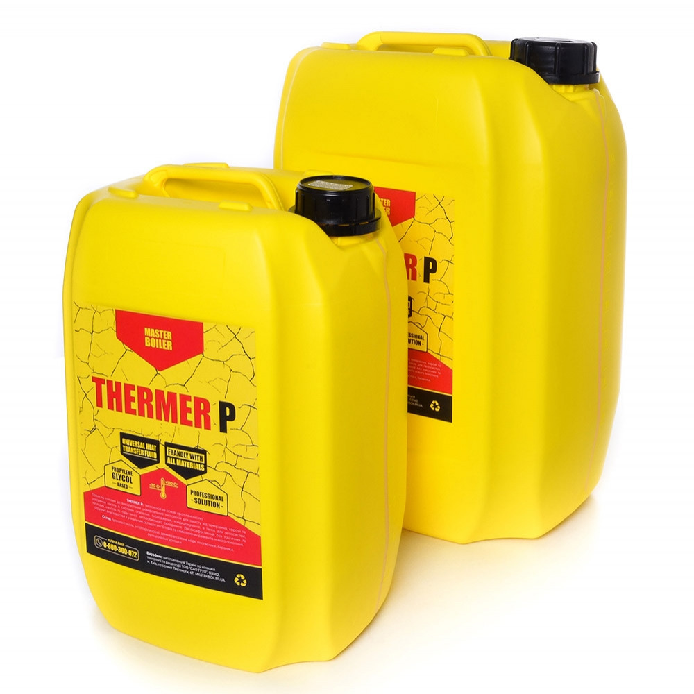 Багатоцільові інгібовані теплоносіки нового покоління, розроблені німецькими фахівцями MASTER BOILER®, за підтримки Інституту неорганічної й аналітичної хімії Технічного університету Клаусталя (Technische Universität Clausthal), у місті Клаусталь-Целерфельд, Німеччина. На цей момент в Україні налагоджено контрактне виробництво основного асортиментного ряду продукції MASTER BOILER ® Рідини для систем опалення й охолодження MASTER BOILER® виробляється у 2 основних серіях DEFENDER® - захисні інгібовані рідини для систем опалення. Не мають незамерзальних властивостей, але призначені для захисту від корозії, накипу та інших відкладень в опалювальних системах. Це ідеальне рішення для заповнення систем після їхнього планового промивання. Також — ідеальне рішення для нових систем опалення. Підходить для металевих і пластикових трубопроводів будь-якого типу, зокрема для систем з алюмінієвими радіаторами опалення. Сумісний з усіма типами опалювальних систем і є найкращим рішенням. Під час використання такого типу теплоносія у Вас не виникне жодних спірних ситуацій із сервісним і гарантійним обслуговуванням опалювальних приладів будь-якого виробника. Більшість торгових марок котлів та іншого опалювального та водонагрівального обладнання знімають із себе гарантійні зобов'язання під час використання незалежних реагентів. У такому разі найкращим теплоносіям буде саме демінералізована вода з додаванням інгредієнтів корозії. THERMER® - незамерзальні інгібовані теплоносійки на основі мінерально-водних сумішей, пропіленгліколю й етиленгліколю залежно від серії продукції, призначені для захисту від замерзання, боротьби з корозією, накип'ю, шумом у котлі та виділенням водню у всіх типах систем нагрівання та закритих систем охолодження, зокрема й алюміній (крім серії THERMER® M). Це ідеальний продукт для котлів на біомасі, що вимагають захисту від замерзання. За правильних умов експлуатації, продукт забезпечує постійний захист і не вимагає заміни понад 5 років. Він ідеально підходить для приміщень, де опалювальна система схильна до підвищеного ризику замерзання через розташування, нерегулярне використання або структуру будівлі. Реагенти на основі пропіленгліколю — найуніверсальніші теплоносійники для будь-яких систем, зокрема й для теплових насосів. THERMER® SOLAR: найкращий теплоносій для геліосистем і сонячних колекторів, де необхідні високотемпературні теплоносійки влітку, а взимку важливі високі незалежні властивості. Характеристики THERMER® 1) Основа теплоносіїв DEFENDER® H2O: демінералізована підготовлена вода + німецькі інгібітори нового покоління MASTER BOILER® THERMER® M: на основі мінерально-водного складу (най бюджетніша інгібована композиція для захисту систем, у яких немає алюмінієві матеріали). THERMER® E: на основі етиленгліколю (низькотоксична композиція для захисту від замерзання, найчастіше використовується в системах охолодження й кондиціювання). Через токсичність не підходить для відкритих систем опалення та систем із поганою герметичністю. THERMER® P: на основі пропіленгліколю (найуніверсальніша й найбезпечніша високоінгельована композиція для захисту від корозії та замерзання систем із будь-яких матеріалів) THERMER® SOLAR: на основі пропіленгліколю + присадки з збільшеним діапазоном робочих температур (найкраще рішення для використання у високотемпературних режима