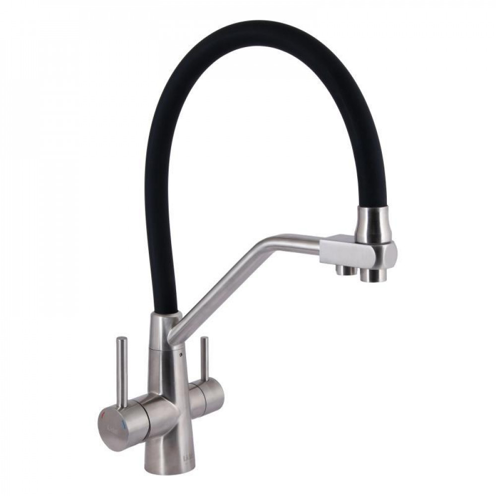 Змішувач для кухні Lidz Aria 020F3 з гнучким виливом та підключенням для питної води (k35) Black / Nickel поєднує функціональність гнучкого виливу та можливість підключення питної води. Чорний колір з нікельованими елементами створює сучасний і стильний дизайн, а високоякісні матеріали забезпечують довговічність та надійність змішувача.